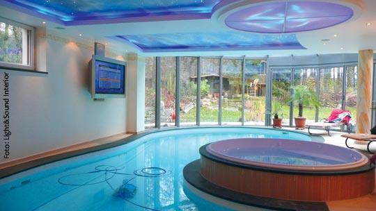 Futuristisch mutet diese von Light & Sound Interior gestaltete Schwimmhallendecke an. Ihre indirekte LED-Beleuchtung scheint in Blau oder Gelb. Kombiniert wurde sie mit einem faseroptischen Sternenhimmel und LED-Poolscheinwerfern, jeweils mit Farbwechsel in Blau-Weiß. Über dem Whirpool thront das besondere Highlight der Halle: LED-Leuchten, wahlweise in Blau oder Gelb, zaubern hinter Acrylglas in unterschiedlicher Tiefe einen ganz besonderen Effekt.