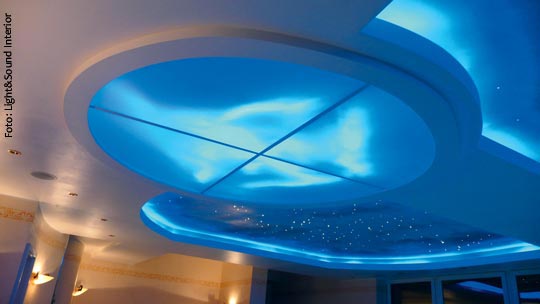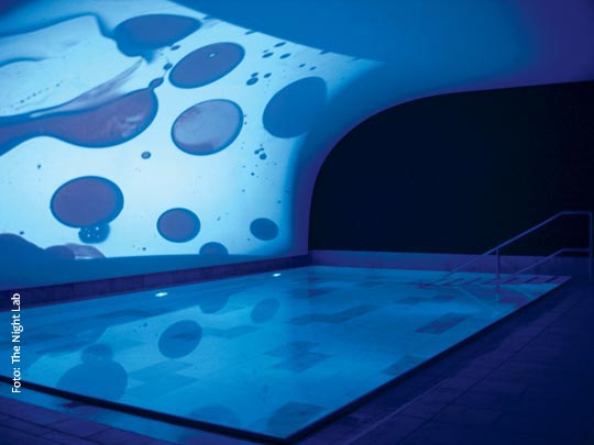 Projektionen erfreuen sich zunehmender Beliebtheit in Wellnessbereichen. Ihr Vorteil: Sie verwandeln große Flächen wie Decken oder Wände in abwechslungsreiche Erlebnislandschaften. Realisieren kann dies The Night Lab, eine Firma, die sich unter anderem auf die Lichtgestaltung von Wellnessbereichen mit LED-Technik spezialisiert hat – auf Wunsch ergänzt durch spezielle Wellnessprojektionen, die mit den Farben des LED-Lichts harmonieren. Auch Kuppelprojektionen können realisiert werden.