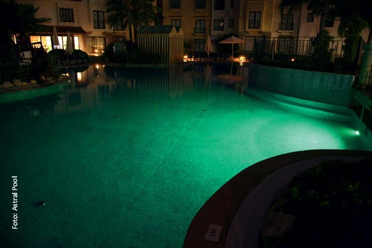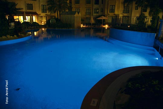 LED-Leuchten zeichnen sich generell durch eine lange Lebensdauer, geringen Stromverbrauch und vielfältige Lichtgestaltungsmöglichkeiten aus. Deshalb werden LED-Leuchten immer stärker auch im Poolbau eingesetzt. In den LED-Unterwasserschweinwerfern „Lumi Plus“ von Astralpool kommen die „Luxeon High Power LEDs“ des Herstellers Philips Lighting mit wahlweise 1 oder 3 Watt Leistung zum Einsatz. Sie zeichnen sich durch eine hohe Leuchtkraft aus und können weißes und farbiges Licht generieren, mit dem sich spektakuläre Farbsequenzen schaffen lassen. Pro 20 m² Wasseroberfläche wird ein „Lumi Plus“-Scheinwerfer empfohlen. Diese sind allerdings nicht nur für den Neubau geeignet – es gibt eine Ersatzlampe für alle PAR-56-Scheinwerfer, mit denen die LED-Technik auch in bestehenden Pools nachgerüstet werden kann.