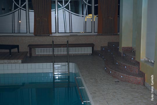 Mit LED-Strahlern lassen sich nicht nur Pools und Hallendecken in Szene setzen, schöne Lichtakzente werden auch durch die Einbindung etwa in Wänden und Böden erreicht. Oder wie in diesem Wellnessbereich in den Stufen – sie wurden mit insgesamt 25 „Eyeleds“ (von Eyeleds) ausgestattet. Die kleinen LED-Strahler können aufgrund ihrer geringen Einbautiefe in fast alle Oberflächen eingesetzt werden.