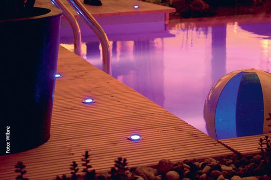 Praktisch und dekorativ zugleich sind LED-Orientierungsleuchten – weisen sie doch den Weg zum Pool, Whirlpool oder zur Sauna. Oder Sie sind einfach nur der guten Optik willen platziert, etwa als Lichtrahmen rund ums Schwimmbad. Dieses robuste Modell von Wibre, der Strahler „4.0010“, ist mit stabilem Edelstahlgehäuse, einer Edelstahlblende und Sicherheitsglas besonders trittsicher. Erhältlich ist er mit LEDs in Weiß, Gelb, Rot, Grün und Blau.