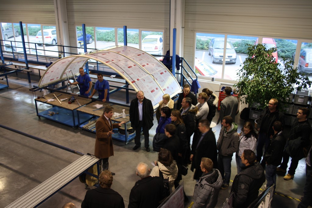 In Györ angekommen wurden alle Topras-Partner herzlich von Robert Kovacs, dem ungarischen Geschäftsführer von Aquacomet, begrüßt. Zusammen mit seinem Exportmanager Sandor Gyori führte er die Gruppe durch das Firmenareal. Auf dem Gelände befinden sich die Produktionsstätten und die Entwicklung der Aquacomet Schwimmbadüberdachungen und der Nautilus Einstückbecken. Hier werden alle speziellen technischen Kundenwünsche und Anfragen bearbeitet. Seit nunmehr acht Jahren ist Aquacomet in Györ und stetig gewachsen. Angefangen hat alles 2005 mit einer einzigen Produktionshalle. Heute gibt es drei. Zusätzlich noch ein Aluminiumlager, in dem alleine 70 verschiedene Profile – meist in fünf Farben – gelagert werden und demnächst noch eine weitere separate Halle, in der die GFK-Einstückbecken produziert werden sollen. Neueste Technologien kommen zum Einsatz, egal ob Aluminiumprofile für Überdachungen gebogen und montiert werden oder ob GFK-Einstückbecken laminiert uns ausgehärtet werden.