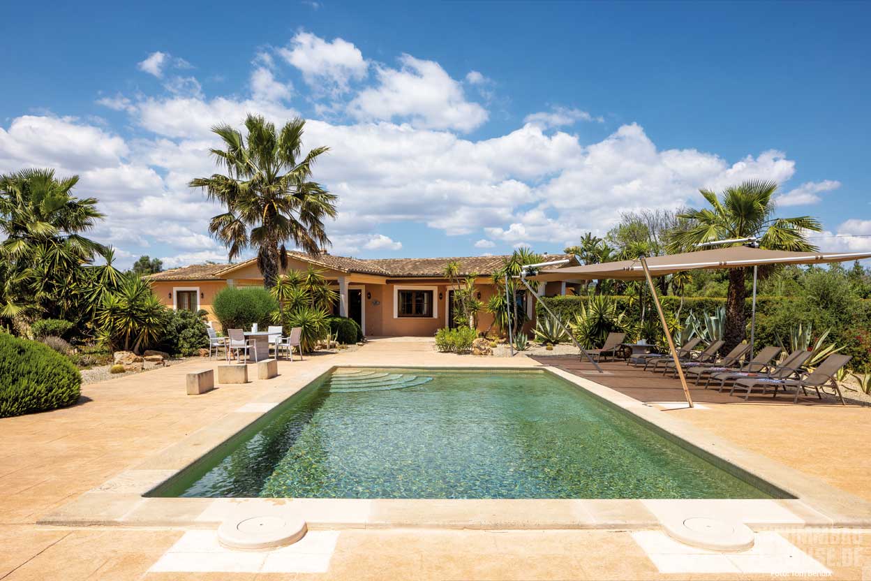 Die „Finca Casa Mas“ ist eine Oase der Ruhe inmitten der mallorquinischen Natur. Das Ferienparadies in Santanyi bietet alles, was das Herz begehrt: Entspannung unterm Sonnensegel, Grillen und Essen auf der Terrasse, Tropical-Feeling sowie Palmengarten – und nicht zuletzt Abkühlung im einzigartigen Salzwasser-Pool mit funkelnden Mosaiksteinchen.