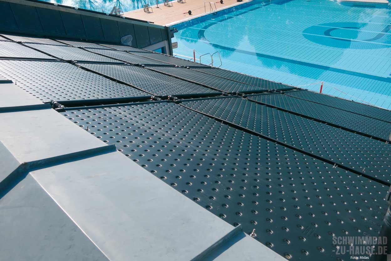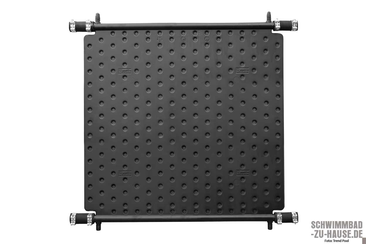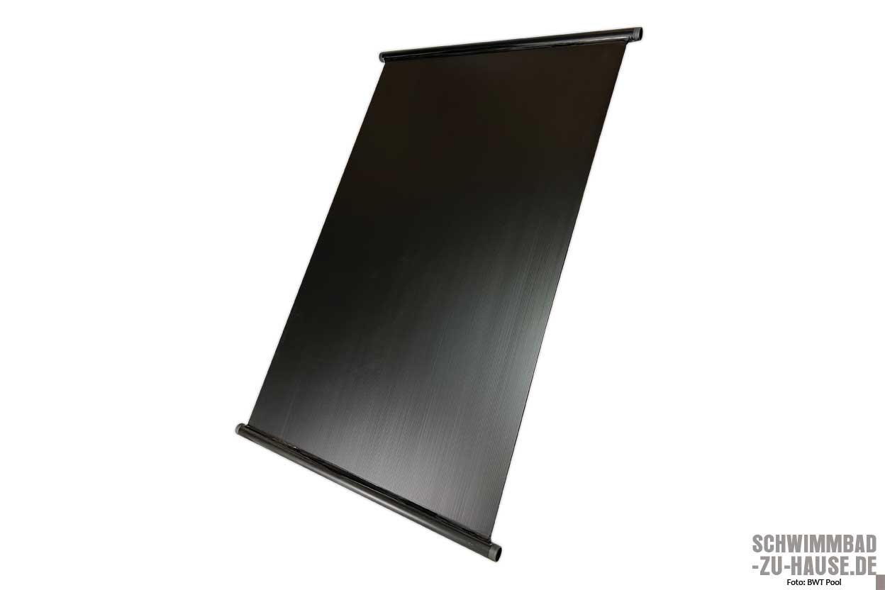 Die Erwärmung des Schwimmbadwassers mit Solarenergie ist besonders umweltfreundlich. Ihrem Namen entsprechend setzt die solare Erwärmung aber auch Sonnenschein voraus – egal, ob mittels Solarmatte, Solarfolie, Sonnenkollektor oder Solarabsorber. Solarplanen bzw. -folien werden in der Regel direkt auf die Wasseroberfläche gelegt, sind die günstige, zugleich aber am wenigsten effektive Form einer Poolheizung. Scheint die Sonne, nimmt die Folie bzw. Plane die Energie der Sonneneinstrahlung auf und gibt sie an das Wasser ab. Da die Abdeckung zugleich die Verdunstung des Poolwassers reduziert, kann die Wassertemperatur (ohne jeglichen Stromeinsatz) meist um bis zu fünf Grad erwärmt werden. Ebenfalls klimaneutral, günstig und wartungsarm sind Solarheizungen. Sonnenkollektoren sollten in unmittelbarer Nähe zum Pool aufgestellt werden und eignen sich besonders bei kleineren Quick-up- oder Frame-Pools. Im Gegensatz zu Solarabsorbern, die sich besonders für größere und Einbaupools eignen, müssen Sonnenkollektoren unterhalb des Wasserspiegels installiert werden. Solarabsorber hingegen werden typischerweise auf dem Dach von Haus, Garage, Gartenhaus oder ähnlichem verbaut. Mit Hilfe der Schwimmbadpumpe wird das Wasser aus dem Pool in den meist schwarzen Absorber geleitet, nimmt dort Sonnenenergie auf, wird erwärmt und fließt dann mit einer höheren Temperatur zurück ins Becken. Zu beachten ist dabei, dass die Strecke zwischen Pool und den Absorberflächen möglichst kurz ist, um Verluste zu vermeiden und die Leistung der Pumpe nicht zu strapazieren. Letzteres ist auch der Grund, warum die Höhendifferenz zwischen der Schwimmbadpumpe und dem obersten Punkt der Solarpaneele nicht zu groß sein sollte. So überzeugend, nachhaltig und gut eine Poolheizung mittels solarer Wärme ist, bleibt jedoch zu bedenken, dass diese leider an einem bewölkten Tag oder einer Schlechtwetterperiode versagt.