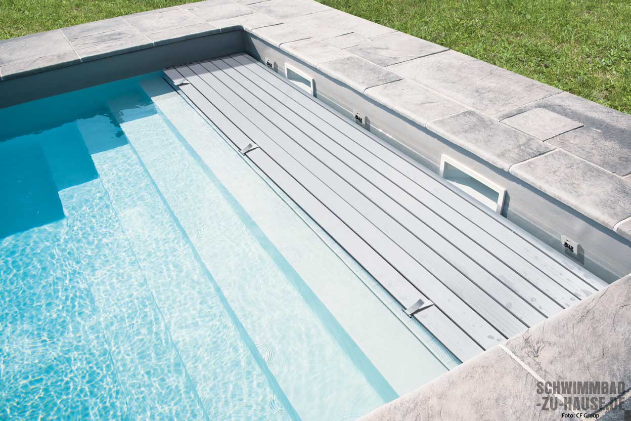 Noch mehr an Sicherheit bieten Rollladen- und Lamellenabdeckungen sowie Pooldecks. Meist nicht zum Begehen ausgelegt, tragen Rollladen- und Lamellenabdeckungen meist kurzzeitig die Last kleiner Kinder und Haustiere, und verhindern ein Ertrinken von Groß und Klein. Möglich macht es unter anderem das besonders schlagfeste Polycarbonat, das auch einen guten Schutz gegen Hagel, größere Äste etc. bietet. Realisiert bei der BAC Pool Systems als Rollschutz-Modelle „Novatrend“, „Multiversal“ oder „Swiss-Top“, verhindern die Sicherheitsabdeckungen bei ordnungsgemäßer Abspannung einen Sturz in das Becken. Ähnliches gilt für die Rollladenabdeckungen von Grando. Speziell die Dreikammer-PVC-Hohlprofile verfügen durch ihre spezielle Formgebung über besonders gute Schwimmeigenschaften, die bei entsprechender Ausführung eine Person tragen können und damit Sicherheit bedeuten. Auch die „Premium color B-2.3“ Sicherheitsabdeckung der CF Group vereint eine hochwertige Verarbeitung, ein patentiertes Edelstahlsystem zur Abspannung und ein stabiles, pilzhemmendes Gewebe. Erhältlich in sieben Farbvarianten lässt sich die Sicherheitsabdeckung ideal auf den Pool abstimmen und bietet ein großes Maß an Sicherheit.