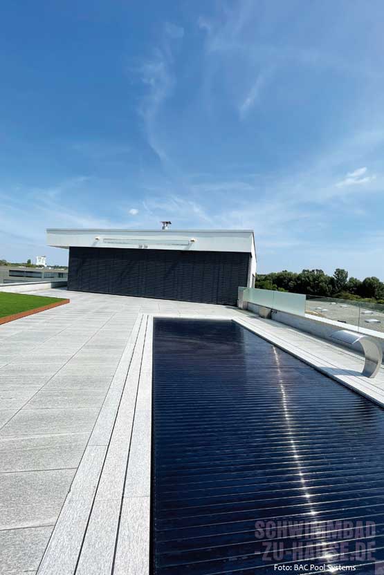 Insbesondere dann, wenn sogenannte Solarabdeckungen eingesetzt werden. Statt das Wasser teuer und aufwendig mittels Wärmepumpe, Wärmetauscher oder Solaranlage aufzuheizen, wird bei Solarabdeckungen die Sonnenenergie auf das Wasser übertragen. Oft aufgeführt als Solarfolie, Solarplane (gerne in Kombination mit Rollladen- oder Stangenabdeckungen) oder Lamellenabdeckung halten Solarabdeckungen den abgedeckten Pool (nachts) warm und heizen das Wasser bei Sonneneinstrahlung zusätzlich auf. In der Theorie und in der Praxis, wie viele Modelle beweisen. Happy Pool und die RW Group Austria setzen beispielsweise auf ein Abdeckungsmaterial mit der „Geo Bubble“ -Technologie. Dieses innovative Doppelnoppensystem erhöht die Lebensdauer des Materials. Da die Solarabdeckung in unterschiedlichen Farben erhältlich ist, kann sie passend zur Poolfolie gewählt werden. Ein weiteres Plus ist, dass die Solarabdeckung als Standardmaß zum selbst Zuschneiden und als konfektionierte Abdeckung zur Montage an einem Aufroller erhältlich ist. Ebenfalls beliebt sind die Solarabdeckungen von Grando und die Rollladen-Modelle „Rollmatic“ von BAC Pool Systems. Die hochwertigen PC-Lamellen (PC = Polycarbonat) bringen Wärme in den Pool und minimieren zugleich das Algenwachstum. Ein zusätzlicher UV-Schutz im Inneren des Materials und separat aufgetragen als Deckschicht, verhindern Versprödung und Vergilbung der Abdeckung. Ähnliches bieten die Schwimmbad- abdeckungen aus hochwertigem UV-stabilisierten Polyethylen von BWT Pool Products. Diese werden auf Wunsch gerne nach Maß gefertigt. Querverschweißte Nähte sorgen für ein faltenfreies Aufwickeln auf die Aufrollvorrichtungen. Und auch die Solarlamellen „Quadro Black“ der T & A Group tragen zu einem solaren Wärmeeintrag bei und sind gefragt. Hauptgrund ist die geringere Verdunstung des Wassers. Diese ist ein wesentlicher Faktor des Wärmeverlustes aller Schwimmbecken und wird von der CF Group für ein 4 mal 8 Meter großes Becken mit rund 200 Litern pro Tag beziffert. Wird hingegen eine Abdeckung eingesetzt, lässt sich der Verlust – abhängig von der Art der Abdeckung – um bis zu 95 Prozent verringern.