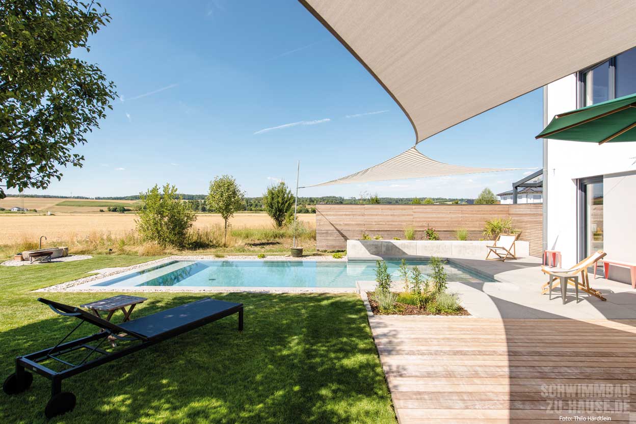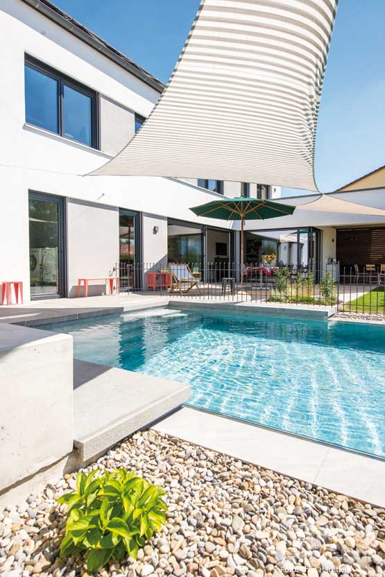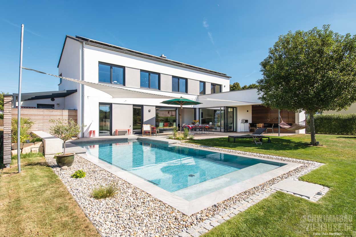 Im oberbayrischen Neuburg an der Donau haben die Hausherren zusammen mit Architekt und Schwimmbadbauer einen idealen Zusammenkunftsort für die Familie geschaffen. Der Outdoorpool befindet sich – zusammen mit verschiedenen Sitzgelegenheiten und Außenessbereich – im Hintergarten des Einfamilienhauses und bietet Badespaß für Groß und Klein.