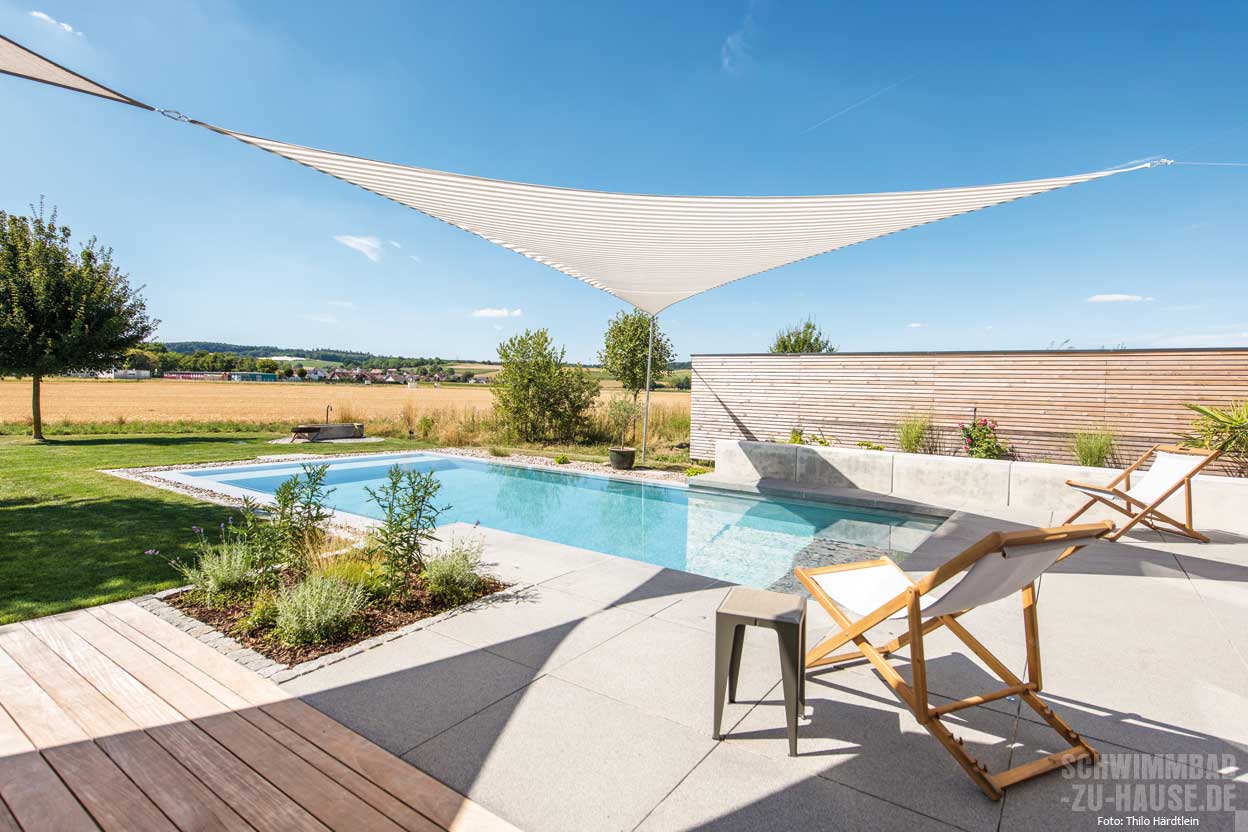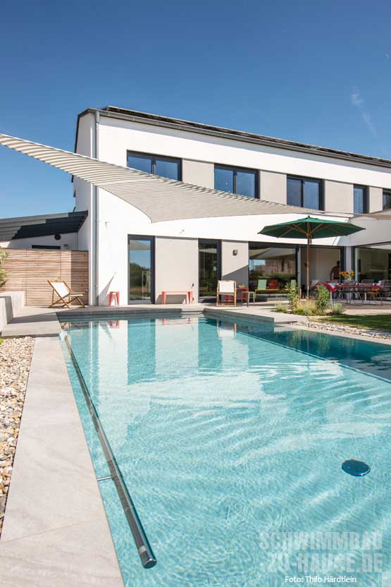 Die Schwimmanlage der Familie aus Neuburg an der Donau dient in erster Linie zum Baden und Planschen. Die drei Kinder des Paares verbringen an warmen Tagen gern ihre Zeit in dem Becken. Auch die integrierte Gegenstromanlage wird kaum zum sportlichen Schwimmen, sondern vielmehr als Spielattraktion durch die Kinder genutzt.