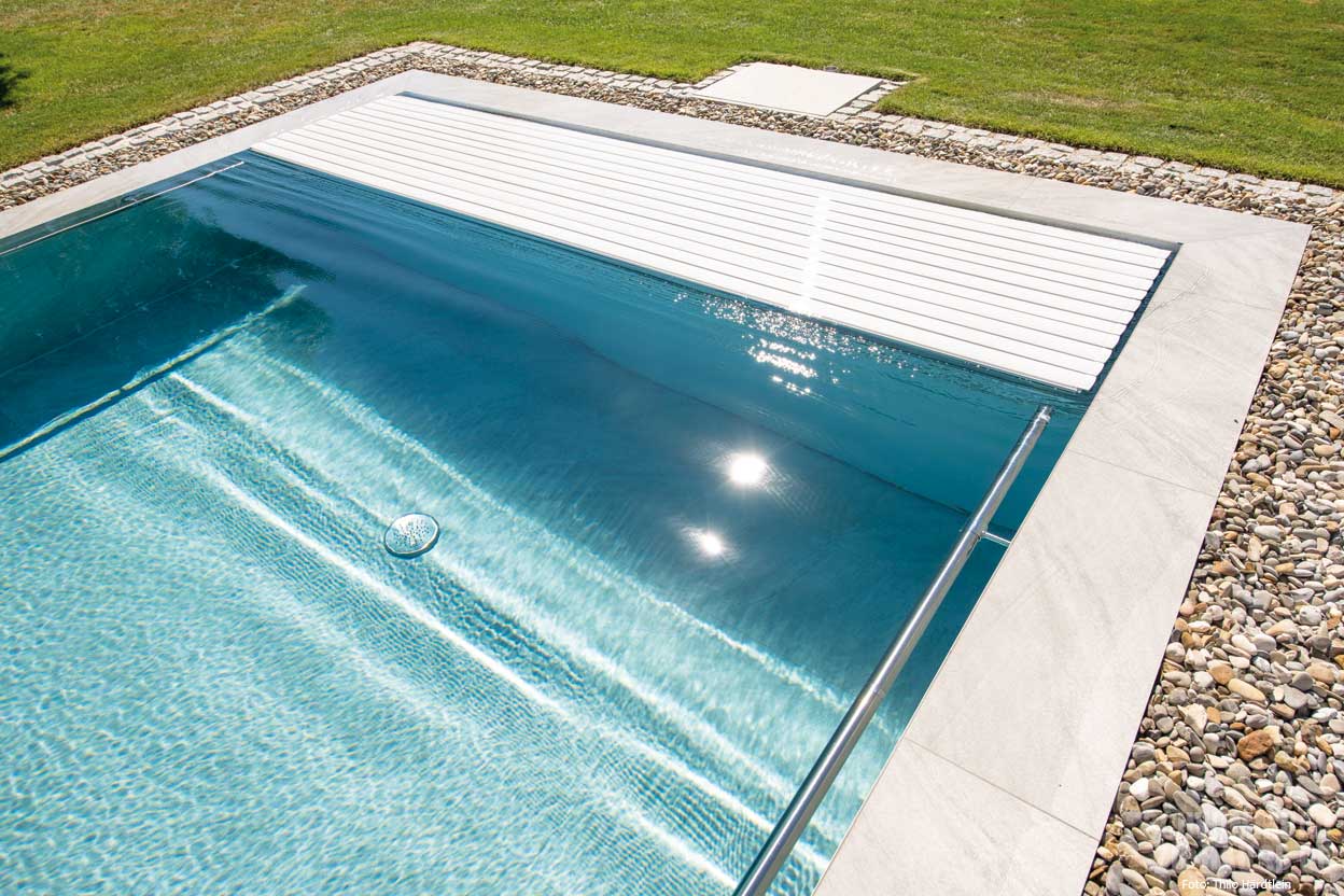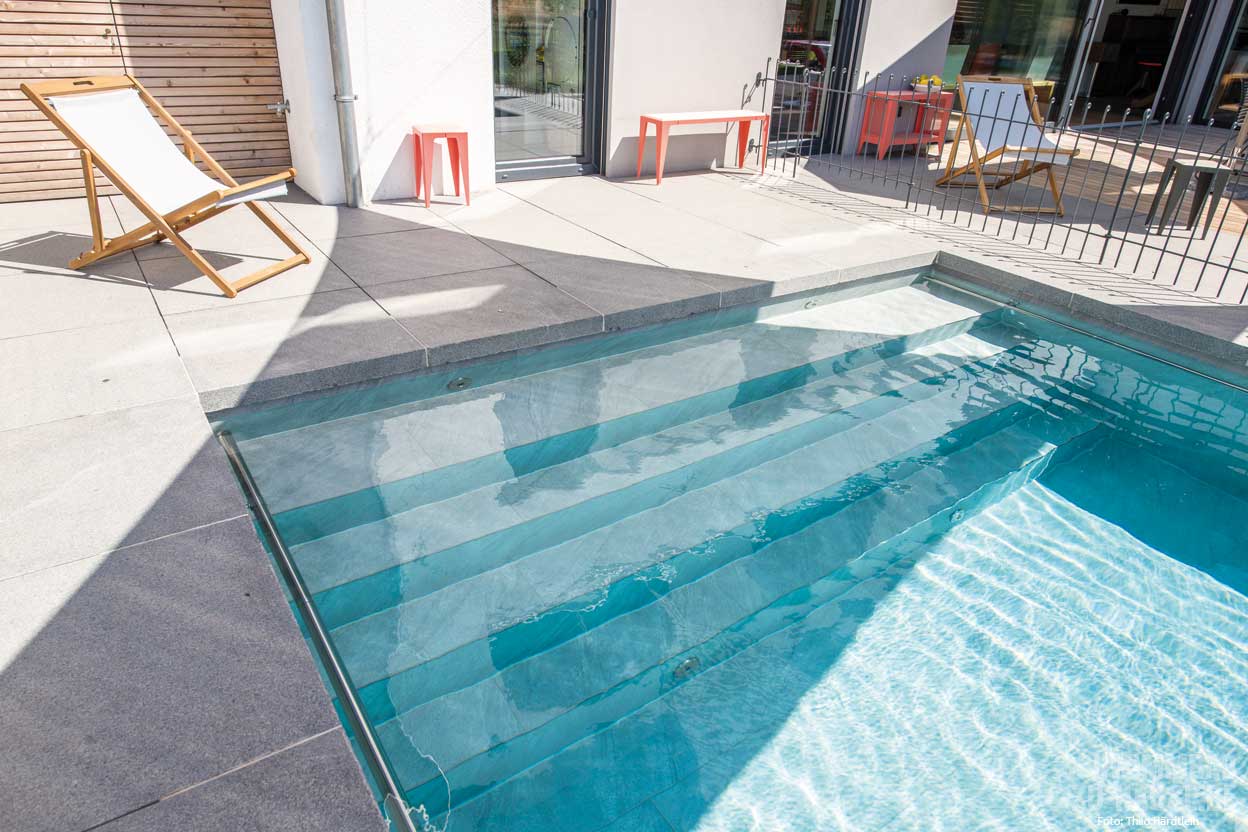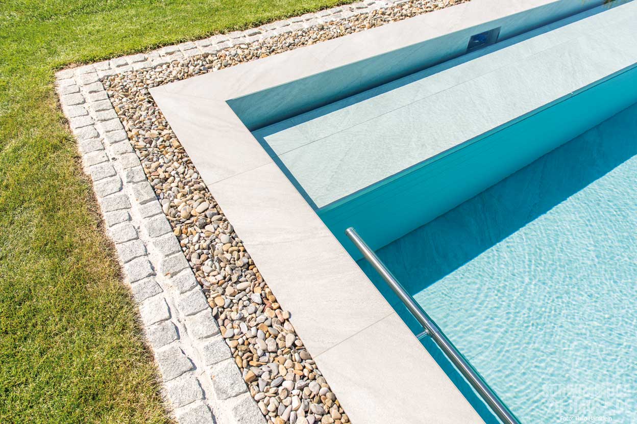 Besonders attraktiv fanden die Hausbesitzer die Optik eines Natursteinpools. Da dies weder mit Kunststoffbecken noch mit Folie zufriedenstellend umgesetzt werden konnte, wurden letztlich schmutzunempfindliche Fliesen aus Feinsteinzeug in Natursteinoptik als Option gewählt. Die Verlegung hat die Firma Rebele aus dem benachbarten Ort in Eigenregie übernommen.