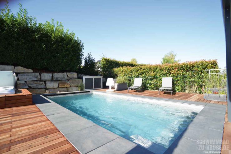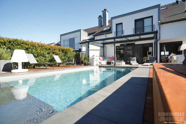 Die Aufgabenstellung lag insbesondere darin, einen fließenden Übergang vom bestehenden Wohnzimmer über die beheizte Terrasse bis in den neuen Pool mit angegliedertem Outdoor-Whirlpool (Comfort Line „R6L“ von Villeroy & Boch) zu ermöglichen. Dabei stand nicht nur der reine Nutzaspekt, sondern vielmehr eine stimmige und ästhetische Gestaltung des gesamten Areals im Vordergrund.