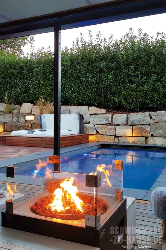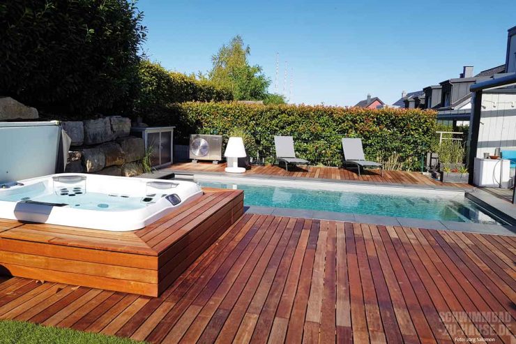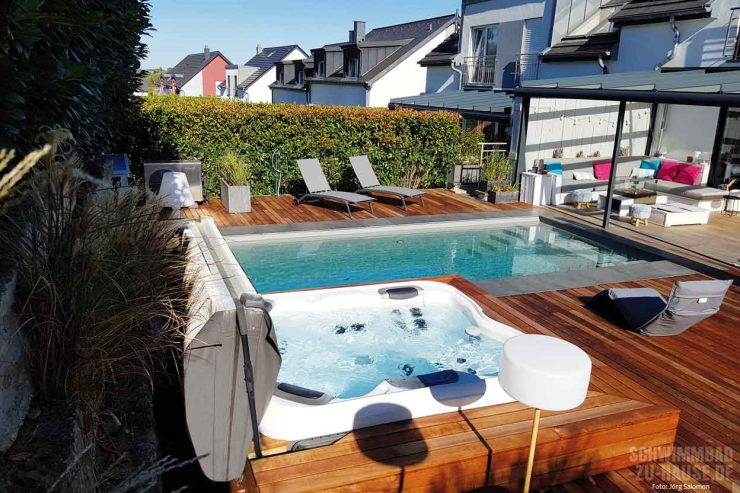 Bereits seit vielen Jahren verlagert sich das Wohnen immer mehr nach draußen in den heimischen Garten. Um das Leben an der frischen Luft noch ein Quäntchen angenehmer zu gestalteten, entschieden sich die Bauherren für einen Outdoorpool. Dieser fügt sich harmonisch in das Gesamtbild des Gartens ein und lädt zu erfrischendem Badespaß ein. Weiteres Highlight: ein moderner Whirlpool, der Entspannung pur garantiert.