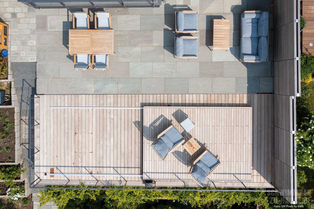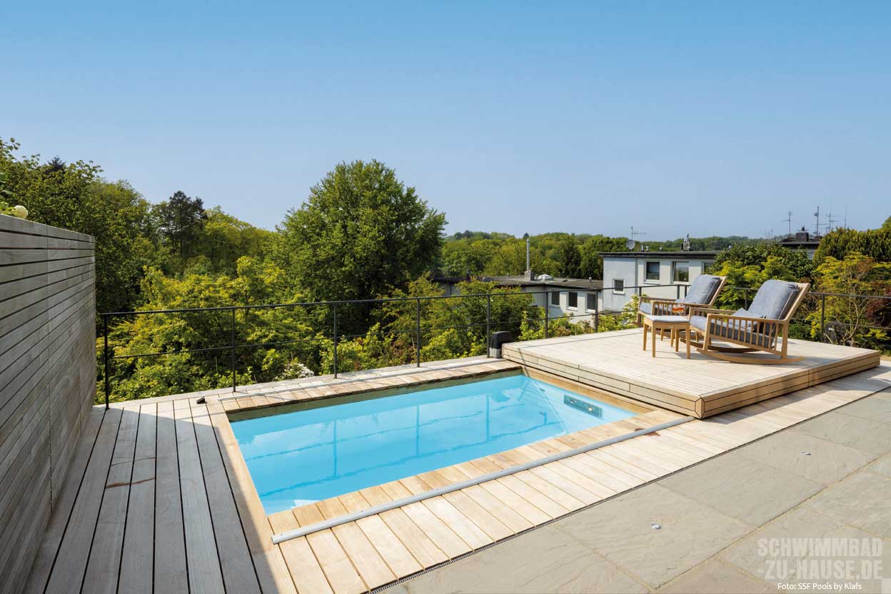 Moderne, einfach zu bedienende Technik, eine leistungsstarke Gegenstromanlage und die optimale Ausnutzung des vorhandenen Platzes zeichnen diesen kleinen, aber feinen Pool in Heiligenhaus aus. Der Clou ist aber ein einteiliges Holzdeck, das den Pool in eine Sonnen- oder Partyterrasse verwandelt. Von hier schweift der Blick auf das satte Grün der darunter liegenden Gärten und die umgebenden Wälder.