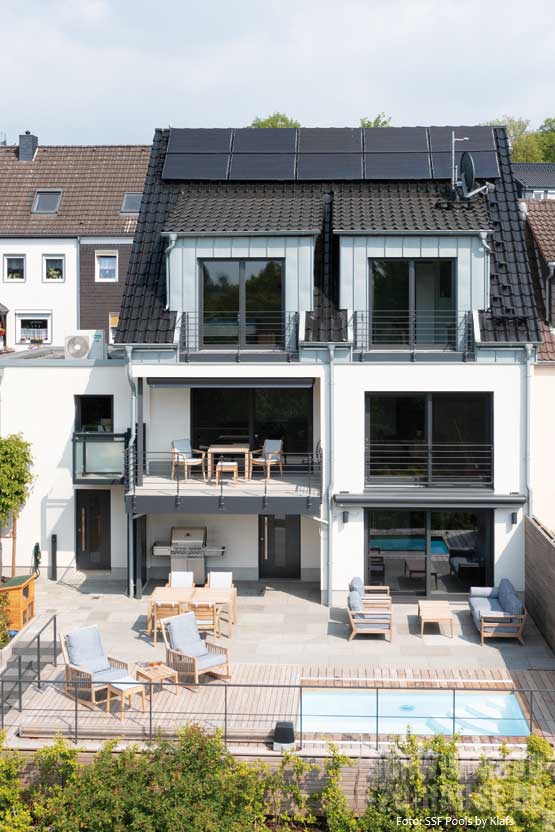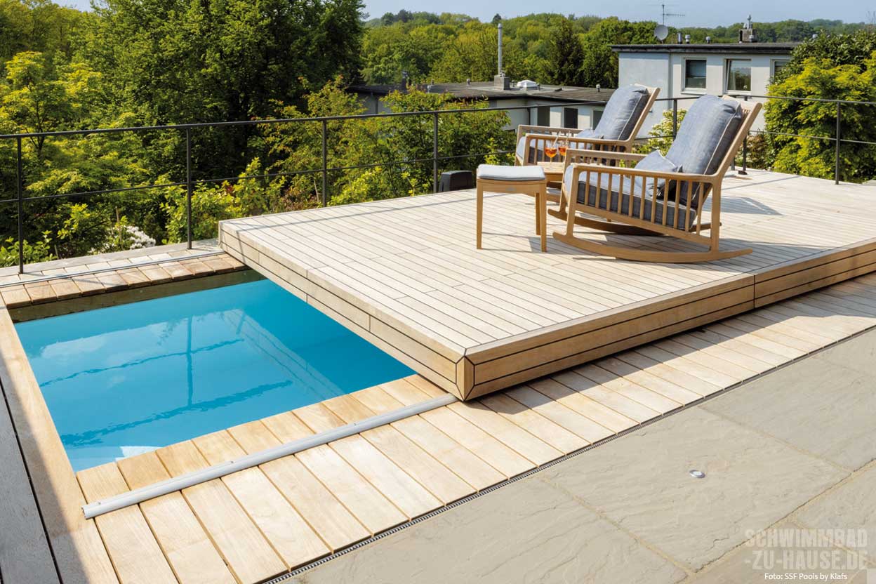 Mit seinen Maßen von 3,70 x 2,10 Metern ist der Pool zwar nicht gerade riesig, dennoch war es angesichts der topographischen Gegebenheiten eine echte Herausforderung, Kunststoffbecken und Holzschiebedach von der Straße auf die am Hang gelegene Terrasse zu befördern und einzubauen. „Arbeiten Sie deshalb nur mit Fachunternehmen, die über die nötige Erfahrung verfügen“, rät Projektleiter Afshin Asan allen Bauwilligen, die Wert auf eine optimale Umsetzung ihrer Wellnessträume legen.