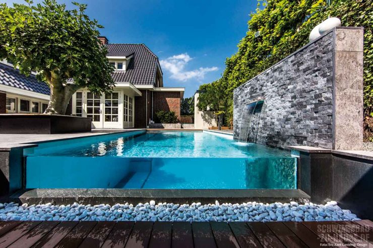 Wichtig war, eine harmonische Verbindung zwischen dem Wohnhaus und dem Garten hinter dem Haus herzustellen. Mit natürlichen Materialien wie Eichenholz und Naturstein, die eine ästhetische Verbindung zu den roten, typisch niederländischen Steinen des Hauses darstellen, gelang die Symbiose zwischen innen und außen. Das Wellnessprojekt ist ein Erlebnis, das im wahrsten Sinnes des Wortes alles kombiniert, was das Herz begehrt. Das außergewöhnliche Schwimmbad fasziniert durch eine geradlinige, moderne Formensprache, eine einladende Wasserfarbe und die außergewöhnliche Gestaltung der Stirnseite des Beckens. Highlight ist hier die durchgezogene Plexiglasscheibe, die es möglich macht, seitlich direkt in das tiefblaue Wasser zu schauen. Dies sorgt für Dynamik und schafft zugleich eine Offenheit, die sich auch bei anderen Details des Gartens wiederfinden lässt. Hierdurch wirken die Übergänge zwischen den einzelnen Komponenten fließend. Auch der plätschernde Wasserfall, der dezent in die Steinwand oberhalb des Pools angebracht ist, schafft eine entspannende Atmosphäre, die das Gesamtbild abrundet. Nach dem Schwimmtraining locken viele Ruheplätze zum Verweilen ein: ob unter dem urigen alten Feigenbaum oder im Schutze des Poolhauses, das neben einem Loungebereich auch über eine Erlebnisdusche verfügt.