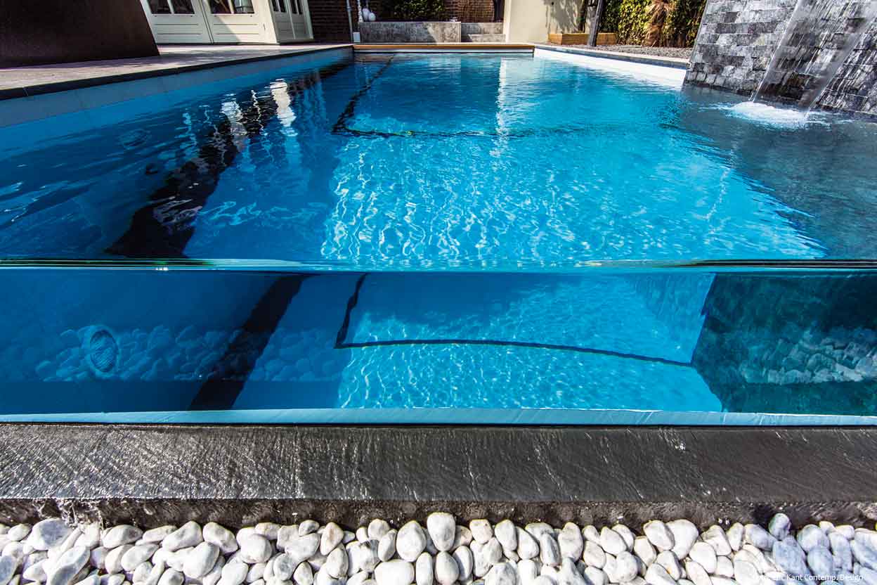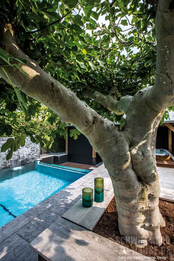 Wichtig war, eine harmonische Verbindung zwischen dem Wohnhaus und dem Garten hinter dem Haus herzustellen. Mit natürlichen Materialien wie Eichenholz und Naturstein, die eine ästhetische Verbindung zu den roten, typisch niederländischen Steinen des Hauses darstellen, gelang die Symbiose zwischen innen und außen. Das Wellnessprojekt ist ein Erlebnis, das im wahrsten Sinnes des Wortes alles kombiniert, was das Herz begehrt. Das außergewöhnliche Schwimmbad fasziniert durch eine geradlinige, moderne Formensprache, eine einladende Wasserfarbe und die außergewöhnliche Gestaltung der Stirnseite des Beckens. Highlight ist hier die durchgezogene Plexiglasscheibe, die es möglich macht, seitlich direkt in das tiefblaue Wasser zu schauen. Dies sorgt für Dynamik und schafft zugleich eine Offenheit, die sich auch bei anderen Details des Gartens wiederfinden lässt. Hierdurch wirken die Übergänge zwischen den einzelnen Komponenten fließend. Auch der plätschernde Wasserfall, der dezent in die Steinwand oberhalb des Pools angebracht ist, schafft eine entspannende Atmosphäre, die das Gesamtbild abrundet. Nach dem Schwimmtraining locken viele Ruheplätze zum Verweilen ein: ob unter dem urigen alten Feigenbaum oder im Schutze des Poolhauses, das neben einem Loungebereich auch über eine Erlebnisdusche verfügt.