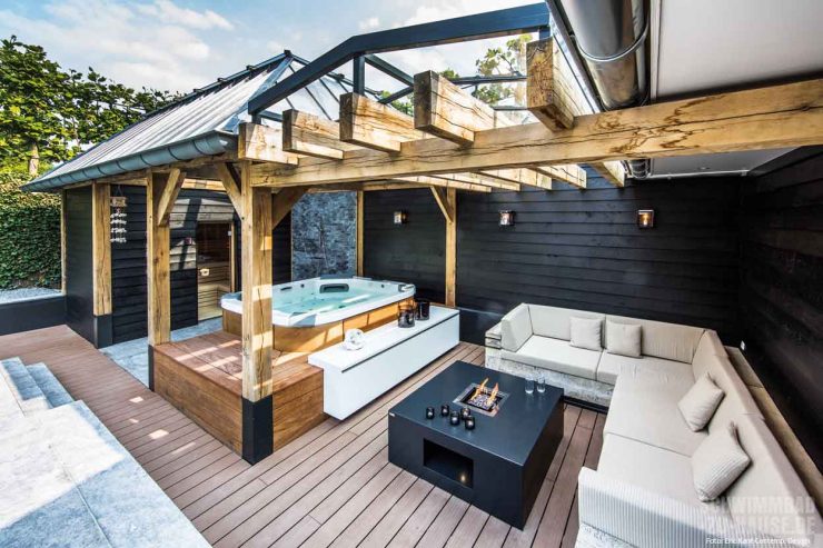 Vor allen Dingen am Abend, wenn der Tag zuende geht und es ruhiger wird, sitzt das Paar am liebsten an der frischen Luft im neu erschaffenen private Spa hinter dem Haus. Mit einem Gläschen Wein vor dem knisternden Feuer genießen sie dann das wohlige Feeling – ganz wie im Urlaub.