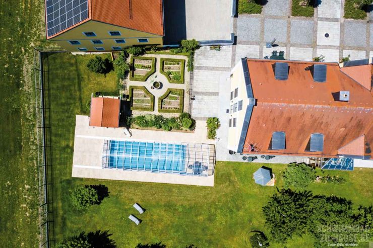 Bauunternehmer erlangte Know-how auch beim eigenen Zuhause anwendete. Neben mehreren großen Gebäuden, in denen eine Zimmerei, ein Wirtshaus und ein großer Veranstaltungssaal beherbergt sind, befindet sich auch das große Wohnhaus der Familie auf dem Grundstück. Hinter den Gebäuden und dem liebevoll angelegten Gemüsegarten öffnet sich ein weitläufiger Garten mit unverbauter Aussicht. Hier haben die fünf Enkelkinder viel Platz zum Spielen, hier finden Gartenpartys statt und hier verbringt die Familie – geschützt durch die Anordnung der großen Gebäude, den Gemüsegarten und eine Sichtschutzmauer – die freien Stunden nach der Arbeit und am Wochenende.