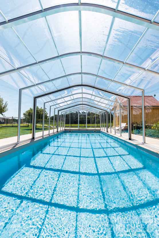„Eine Schwimmbadüberdachung hat viele Vorteile“, erläutert Edgar Wolf von Vöroka. „Die Badesaiaon wird merklich verlängert, indem sich das Wasser im Frühjahr schnell aufheizt und im Herbst die Wärme im Becken gehalten wird.“ Selbst bei Minusgraden können im Inneren der Halle bis zu 25 Grad herrschen, da die Sonneneinstrahlungdurch das transparente Dach eindringt und die Halle erwärmt. Ein weiterer Pluspunkt der kubischen Hochüberdachung ist der Schutz vor Verschmutzungen. Jeden Abend schließt die Bauherrin die Halle, um zu verhindern, dass in der Nacht Staub, Blätter und Äste ins Badewasser fallen. Und auch Tiere wie Igel oder Feldhasen werden dadurch vom Pool ferngehalten.