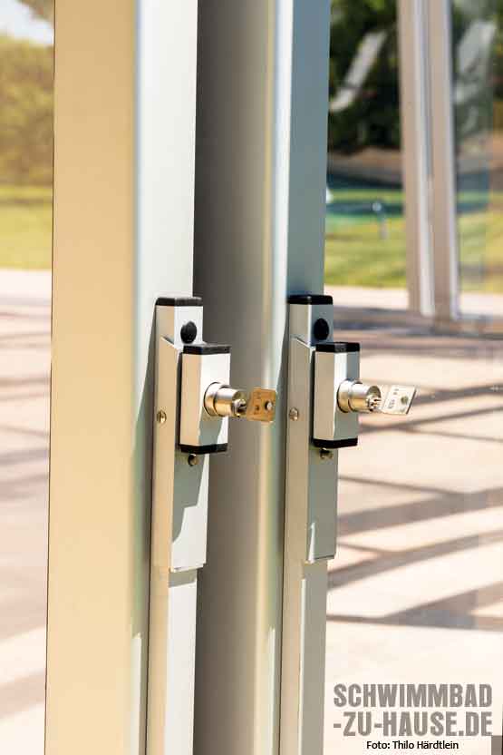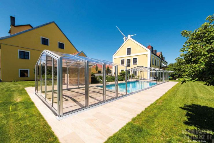 „Da es bei uns aufgrund der schönen, abgelegenen Lage sehr windig ist, lag ein besonderes Augenmerk auf der Überdachung des Pools“, verrät die Bauherrin im Interview mit haus+wellness*. Als der Sohn des Paares nach dem Besuch bei einem Freund dessen Schwimmbecken mit einer Überdachung der Firma Vöroka sah, war klar: So etwas passt ideal zum neuen Pool der Eltern! In enger Zusammenarbeit mit Edgar Wolf von Vöroka fand man im Folgenden exakt die Überdachung, die alle ästhetischen und praktischen Vorlieben der Bauherren erfüllte. Mit den Abmessungen von 16,20 x 5,10 und einer Höhe von 2,80 Meter entschied man sich für eine besonders großzügige Halle, die an der Stirnseite des Beckens auch einen Bereich zum Umkleiden und Entspannen bietet. Während alle Profile aus überaus resistentem, matt Silber eloxiertem Aluminium bestehen, präsentieren sich die Wände in vier Millimeter dickem Polycarbonat. Wichtig war, dass alle Türen abschließbar sind. So können die Enkelkinder ohne Zustimmung der Erwachsenen den Pool nicht betreten, sofern die Überdachung geschlossen ist. Die Halle wurde in vier einzelne Elemente aufgeteilt, wobei sich die Elemente jeweils einzeln in beide Richtungen über die Schienen am Beckenrand verschieben lassen.