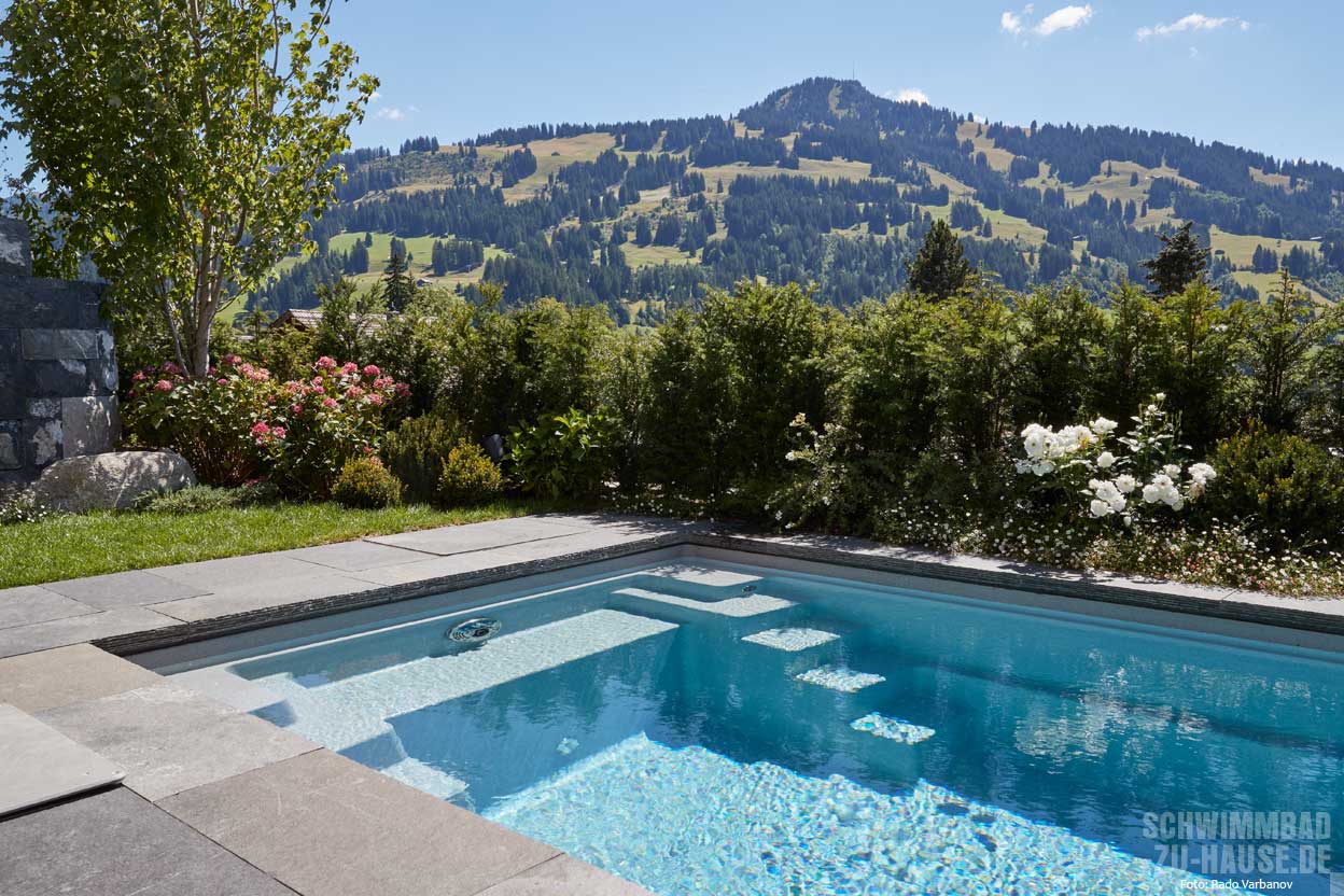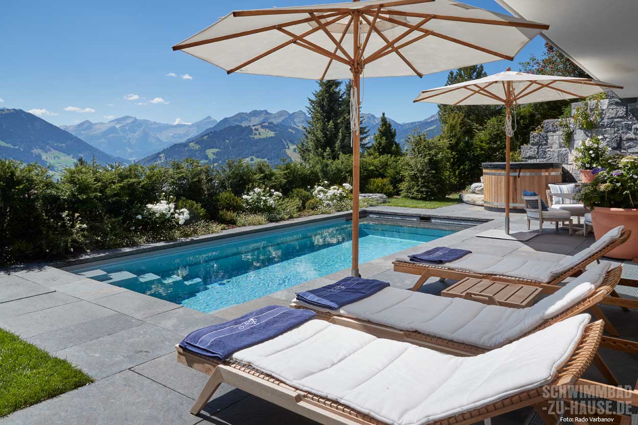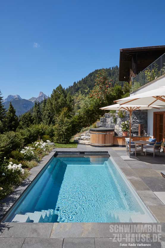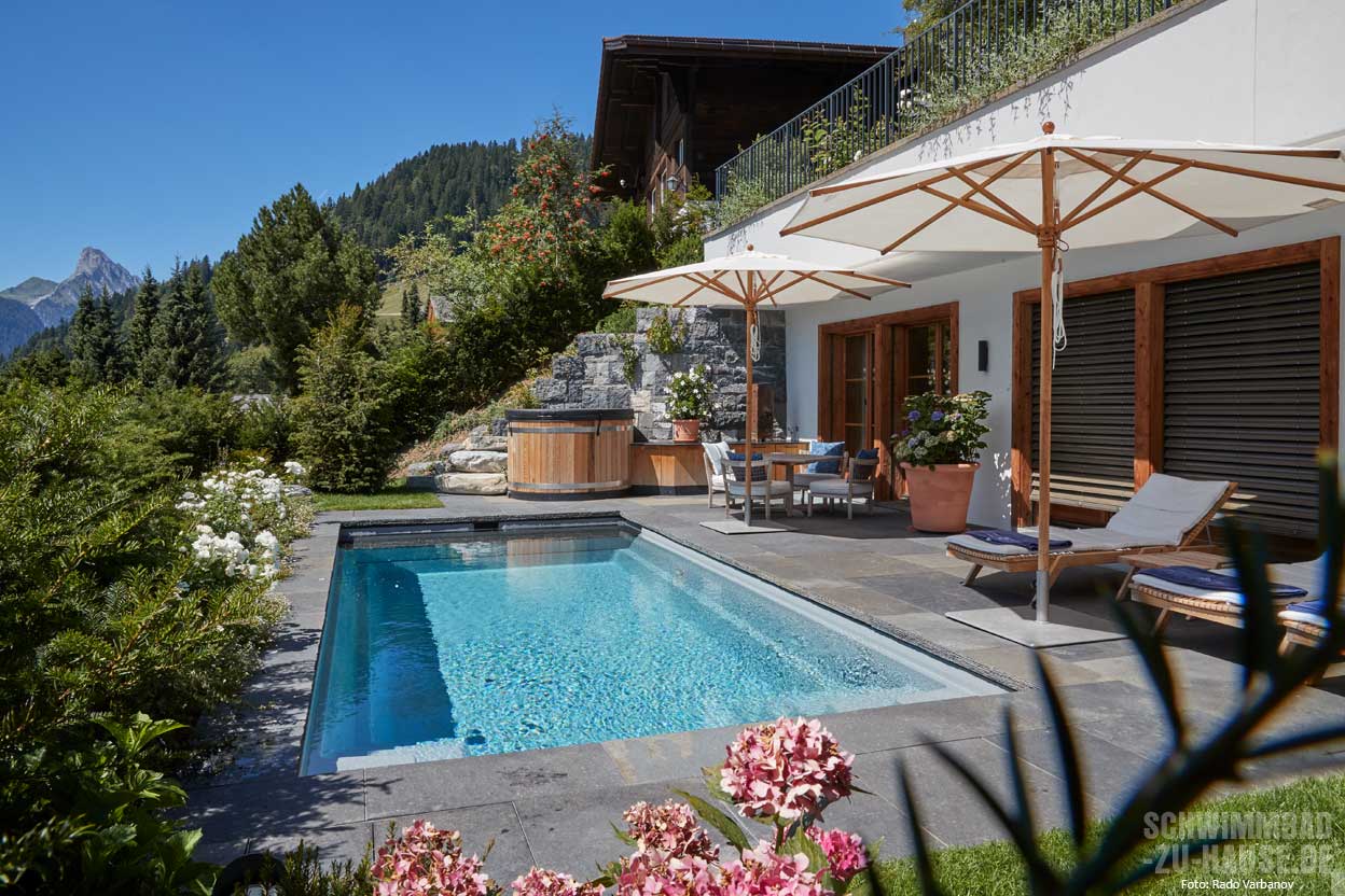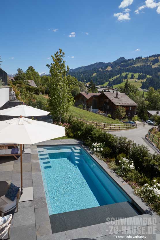 Immer schönere Sommer und die Liebe zum Wasser haben die schwimmbegeisterten Bauherren dazu bewogen, zeitgleich mit dem neuen Haus auch einen Pool zu verwirklichen. Das Schwimmbad auf 1236 Metern Höhe in den Berner Alpen ist nicht nur ein Badeparadies für Groß und Klein, sondern wird durch die Beleuchtung auch in der kälteren Jahreszeit zu einem Blickfang, an dem sich die Hausbesitzer erfreuen.