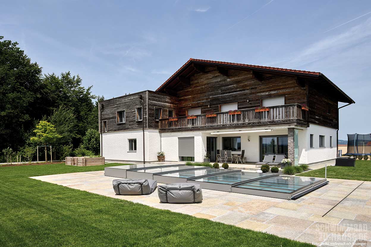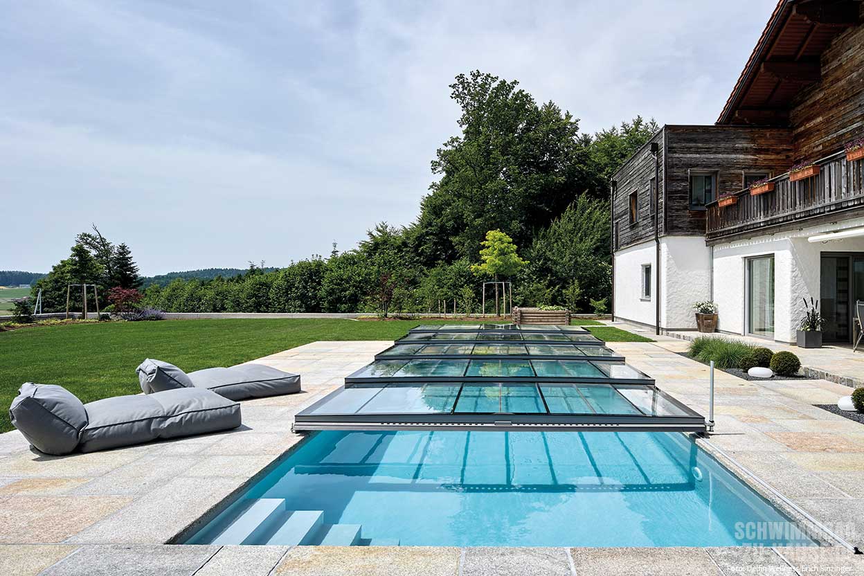Die hochwertige Echtglasüberdachung überzeugt durch ihre Strapazierfähigkeit und Ästhetik. Das Modell verfügt über fünf Schiebeteile, die eine flexible Nutzung ermöglichen – perfekt für den Einstieg, Belüftung oder Reinigung. Dank der großen Tandem-Leichtlaufräder lässt sie sich spielend leicht verschieben – für mehr Flexibilität bei Nutzung und Pflege. Die Konstruktion ist auf die extremen Schneelasten der Klassen SK3 bis SK5 ausgelegt, was sie perfekt für den Einsatz in den kühlen Wintermonaten der Alpenregion macht. Zusätzlich steht eine Spurprofilverlängerung von 3.000 Millimeter zur Verfügung, die eine individuelle Anpassung der Überdachung ermöglicht und eine großzügige Nutzung des Pools in dessen gesamtem Ausmaß gewährleistet.