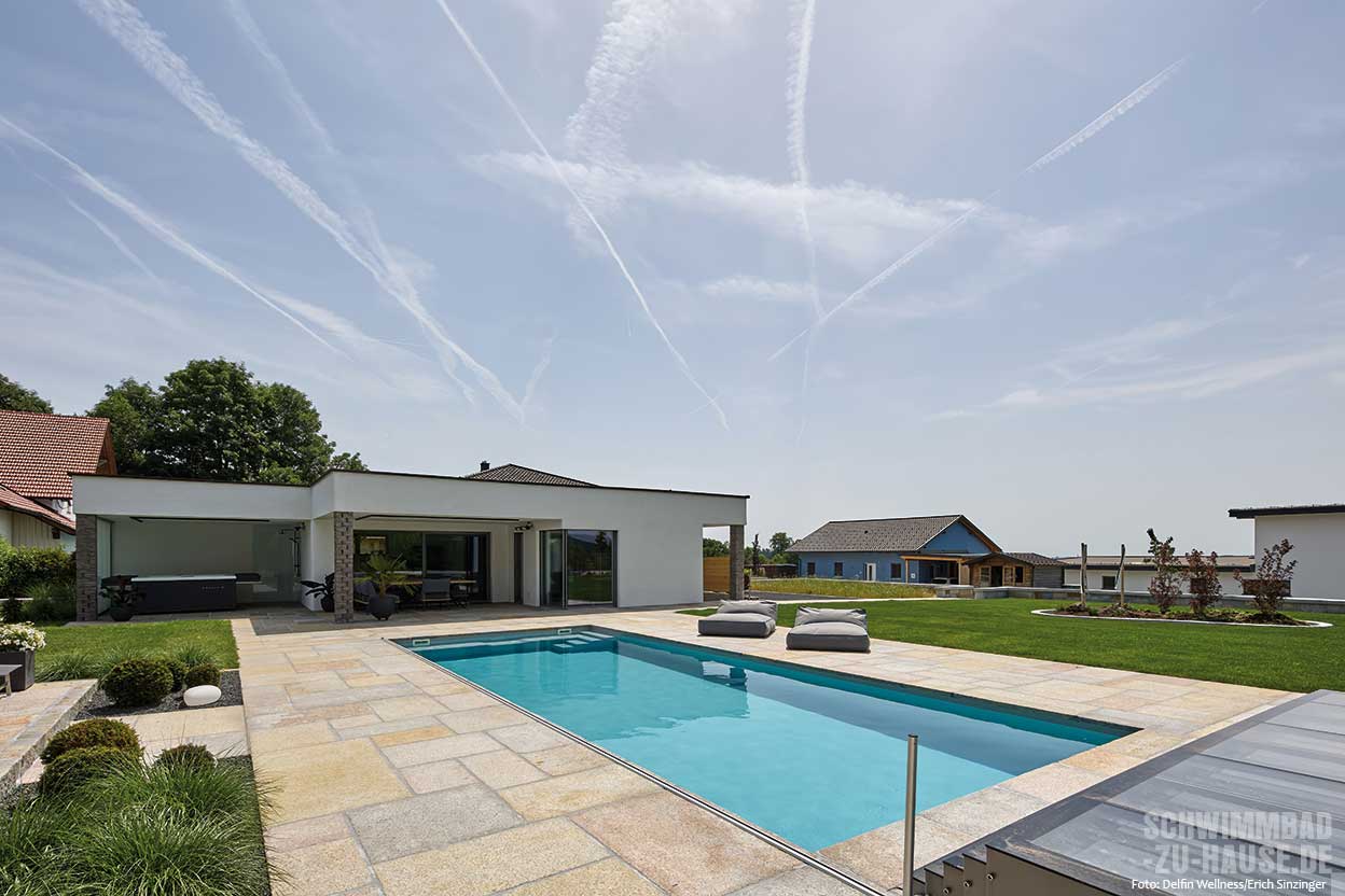 Die Poolanlage wurde so gestaltet, dass sie vielfältig genutzt werden kann: Eine integrierte Stufe mit Sitzbank lädt zum entspannten Verweilen ein, während die Salz- elektrolyse für kristallklares, hautschonendes Wasser sorgt. Abends tauchen LED-Leuchten den Pool in ein atmosphärisches Licht, das den Aufenthalt im eigenen Garten zum Erlebnis macht. Für aktiven Spaß oder sportliche Betätigung sorgt die Gegenstromanlage, die das Wasser in Bewegung hält und Schwimmerherzen höherschlagen lässt.