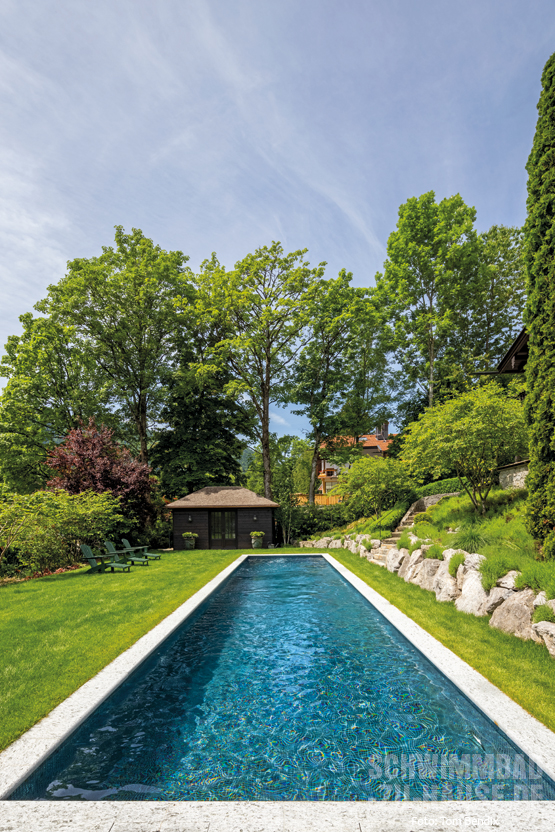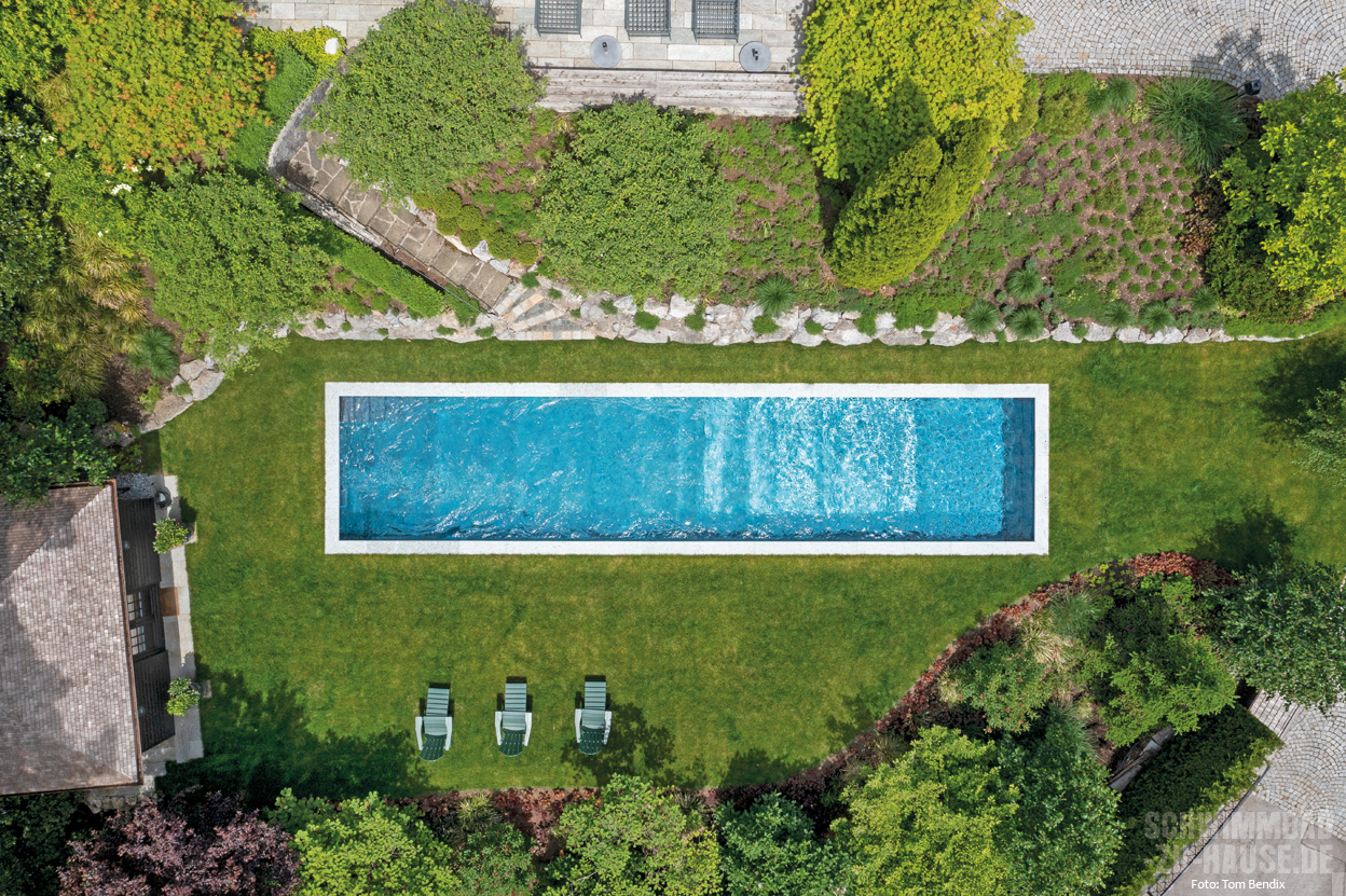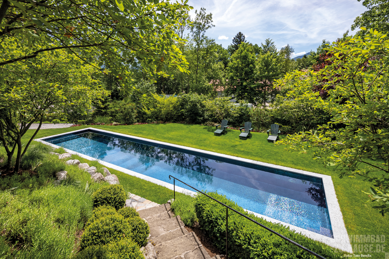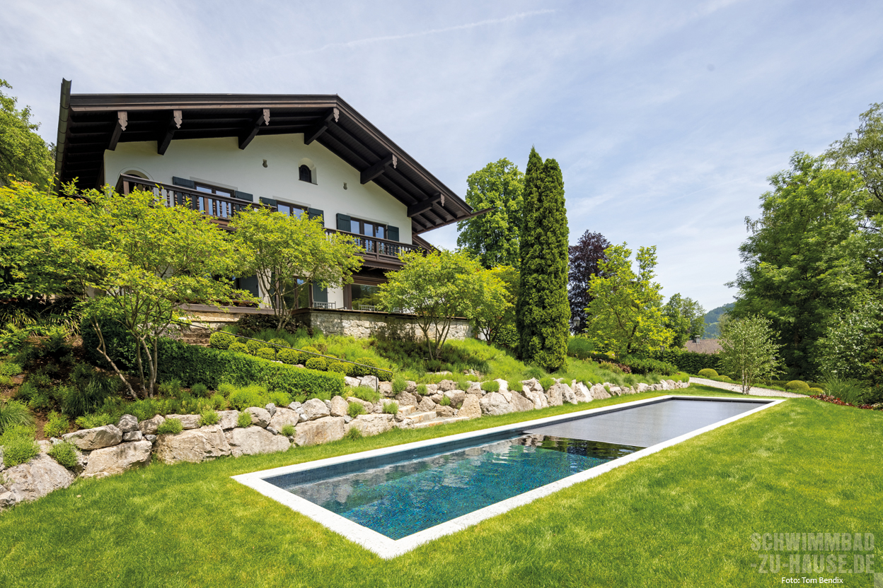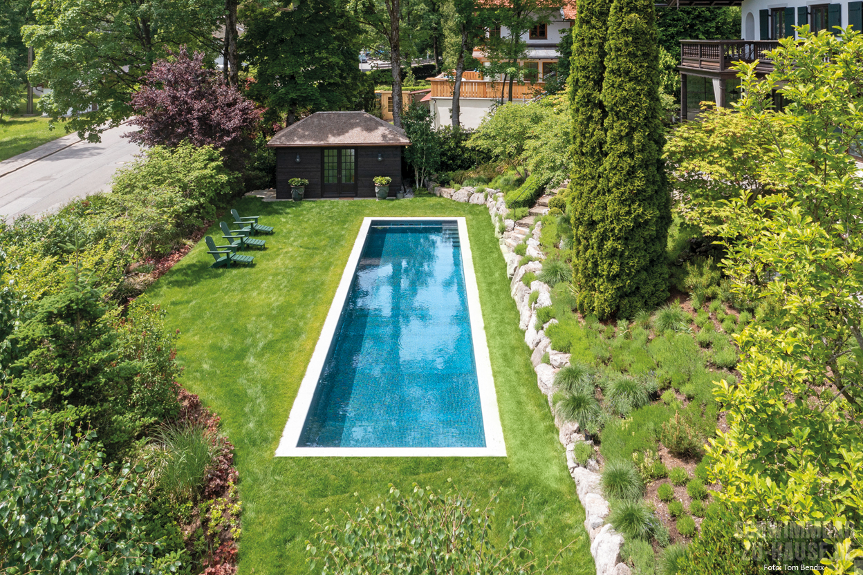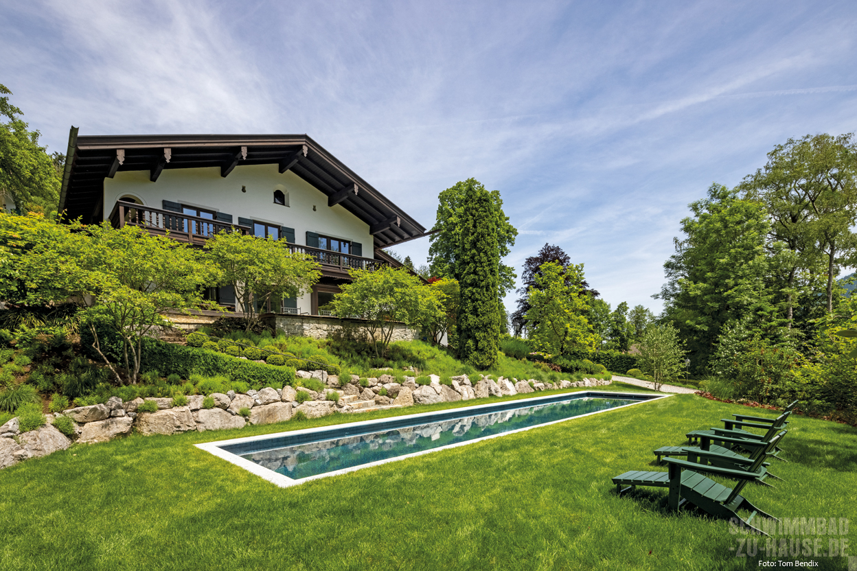 Schon immer war ein eigenes Schwimmbad ein großer Wunsch dieser Familie am Tegernsee. Gerade durch den traditionellen Baustil des Hauses kommt inmitten von sattem Grün der nun fertiggestellte Poolbereich wunderbar zur Geltung.