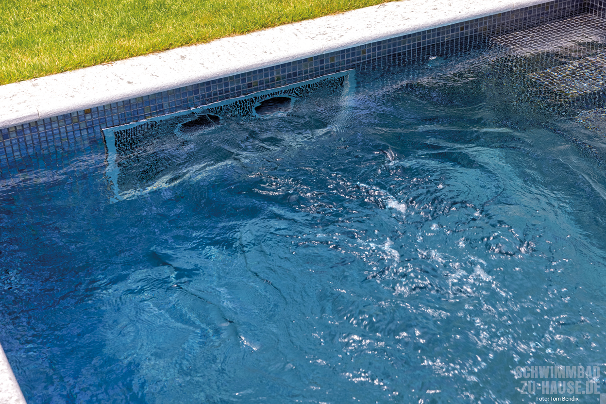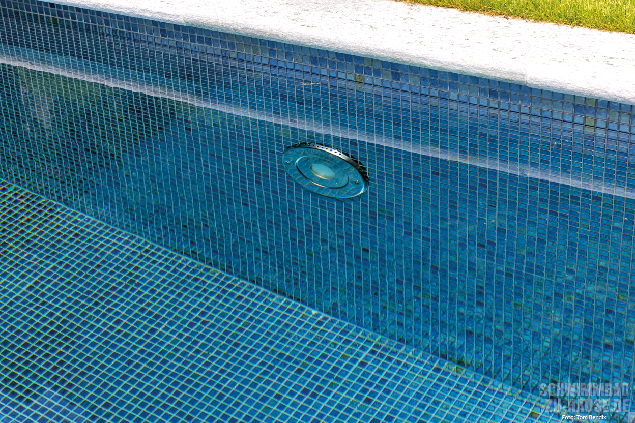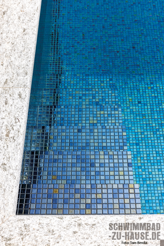 Ohnehin macht es beim vorliegenden Projekt Sinn, den Pool für sich sprechen zu lassen. Das 15,00 x 3,20 x 1,50 Meter große „MLine“-Fertigbecken von Rivierapool wurde mit feinstem Ezarri-Glasmosaik ausgestattet und erzeugt so, je nach Blickwinkel und Lichteinfall, aufregende Farbreflexionen. Auf diese ansprechende Form der Beckenauskleidung wurde der Auftraggeber durch einen Bekannten aufmerksam.
