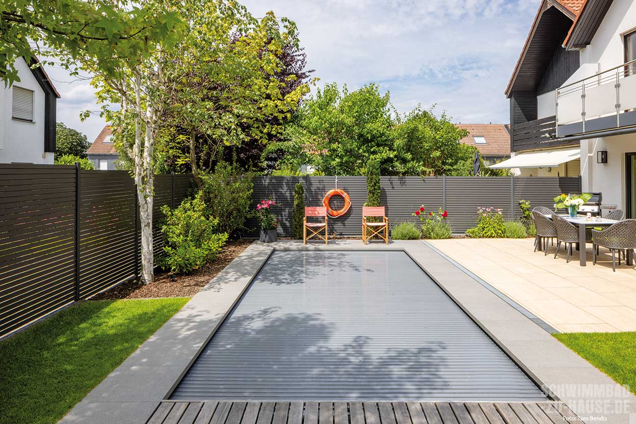 Die Müllers fanden ihren Partner bei Poolfab. Das Unternehmen übernahm die komplette Umsetzung: von der Planung über den Aushub bis zur technischen Installation. Das gewählte Fertigbecken stammt von LPW Pools und misst 7,50 x 3,20 x 1,50 Meter. Es ist mit einer „Covrex Solar”-Unterflurrollladenabdeckung ausgestattet, die nicht nur Energie spart, sondern auch für eine klare Optik sorgt.