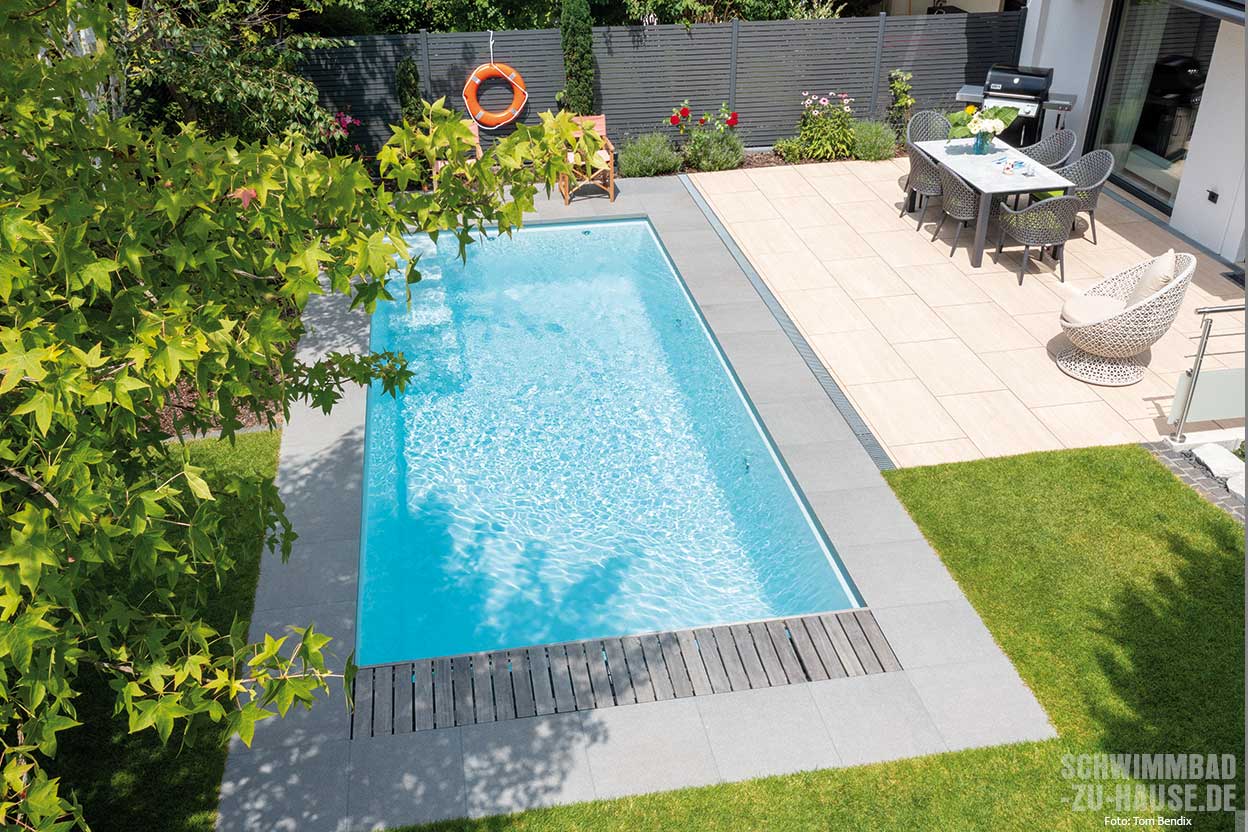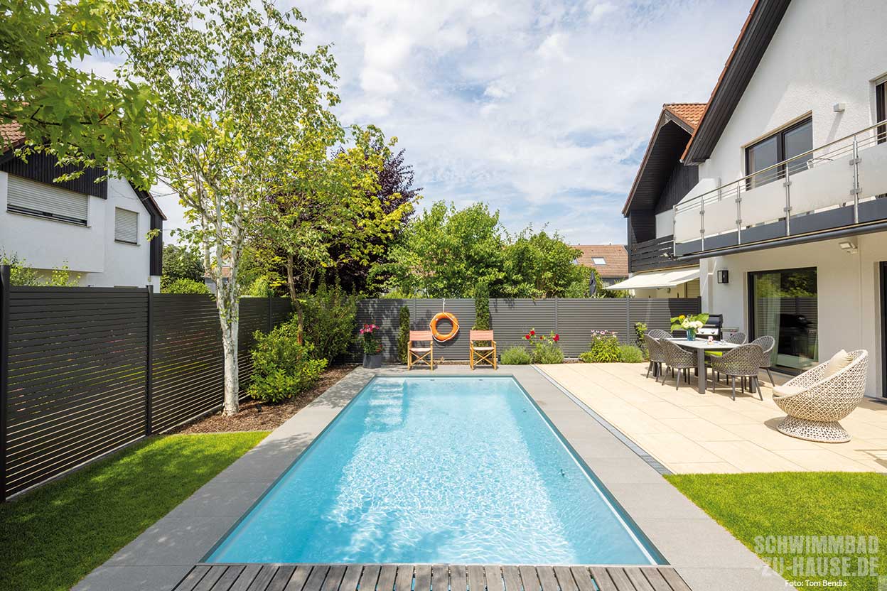 Mit jeder Ausgabe von haus+wellness* wuchs die Idee. Die praktischen Tipps, das technische Know-how und die inspirierenden Projekte gaben Mut zur Umsetzung – auch für den bereits vorhandenen kleinen Wellnessbereich mit Sauna. Herzstück sollte ein Pool werden, der sich nicht nur funktional, sondern auch gestalterisch harmonisch in den Reihenhausgarten einfügt. Eine Anlage, die durchdacht ist und langfristig Freude macht. Mit integrierter Solarabdeckung zur Minimierung des Wärmeverlusts, automatischer Dosieranlage für die Wasserpflege, energieeffizienter Wärmepumpe und moderner Steuerung per App.