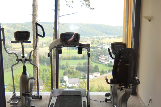 Diesen Ausblick hat man aber nicht nur, wenn man im Café oder auf seiner Terrasse sitzt, auch durch die riesige Fensterfront im Wellness­bereich ist der Name Schönblick Programm. Der Wellnessbereich wurde zum Start des Hotels neu gebaut und bietet neben einem Schwimmbad, diversen Saunen und Infrarotkabinen auch eine große Auswahl an Treatments. Dabei ist der schöne Ausblick das beherrschende Thema. Alle Spa-Anwendungen sind so konzipiert, dass man den Blick über Eichstätt genießen kann. Sogar bei den Massagen könnte man durch den?Fitness­raum über das Altmühltal blicken – hier empfiehlt es sich aber, die Augen zu schließen und sich komplett der Ent­spannung hinzugeben.