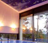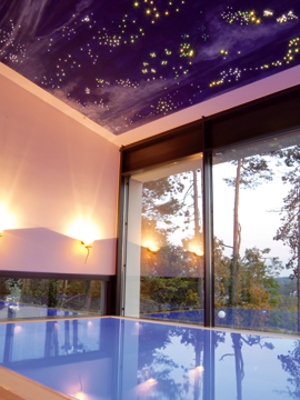 Für Entspannung sorgt auch das zehn mal sechs Meter große Schwimmbad, das tatsächlich in einem Stück angeliefert wurde. Der hohe Aufwand hat sich gelohnt, beim Schwim­men oder dem Genuss von Wassermassage lässt sich wunderbar relaxen. Und danach geht es noch in die vier Meter lange Sauna aus Polarfichte, bei der eine Seite komplett aus Glas besteht. So lässt sich der Pano­rama­blick ins Altmühltal bewundern. Als Alternative steht ein Dampfbad für rund zehn Personen bereit. Das von den Schwimm­bad-Experten von Arosa konzipie­rte und gebaute Schwimmbad hat noch eine Besonderheit parat. Über dem Schwimmbad erstrahlt ein Sternenhimmel – vor allem abends ein tolles illuminiertes Schauspiel.