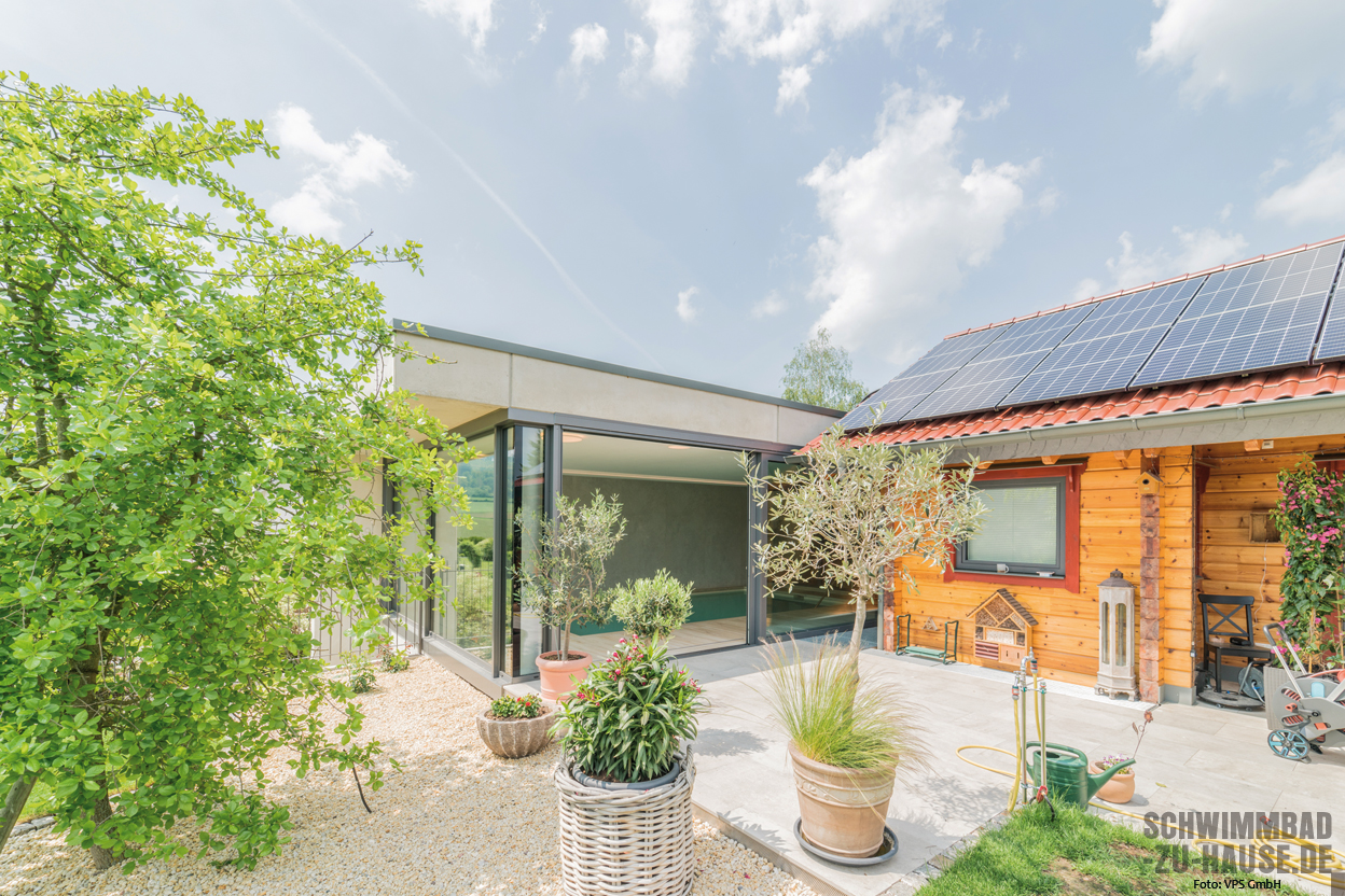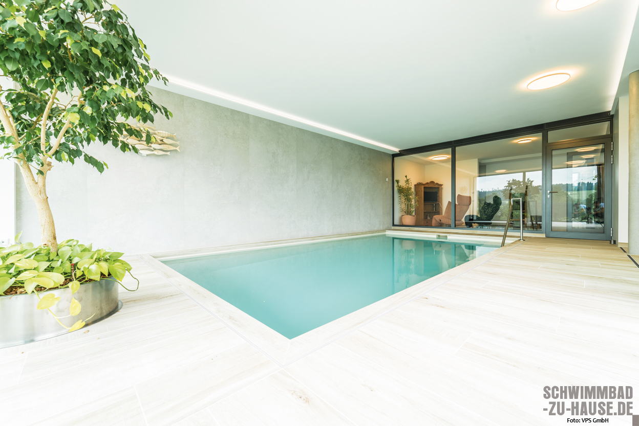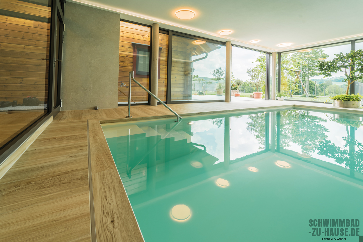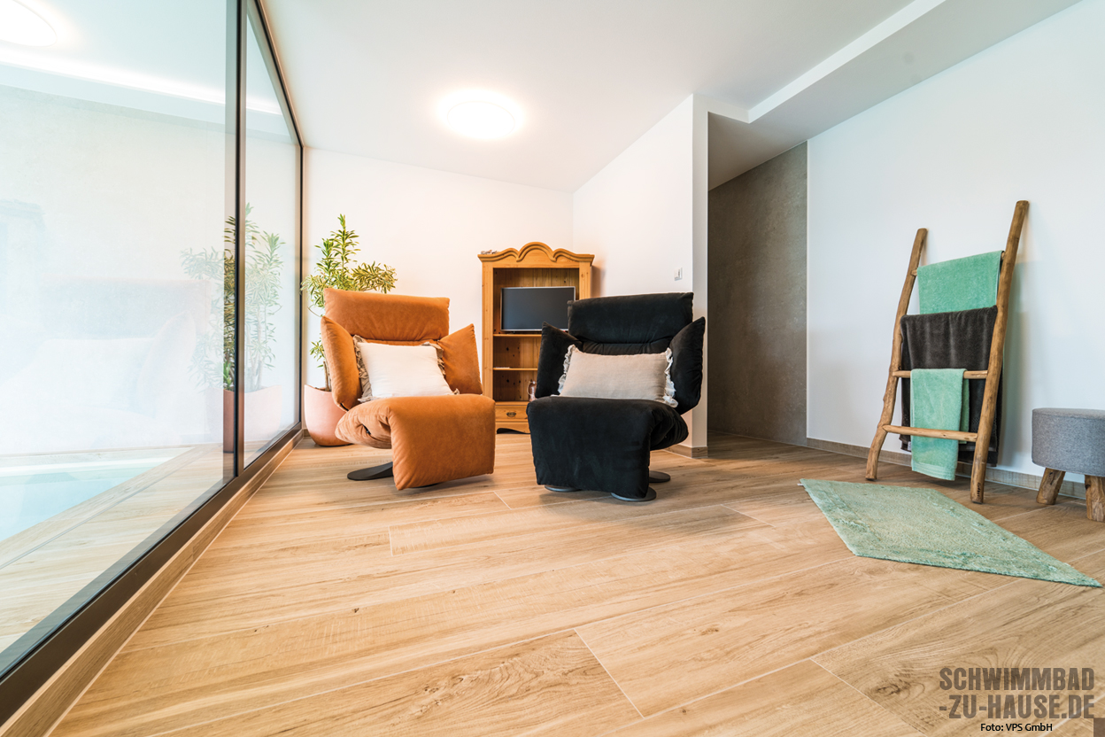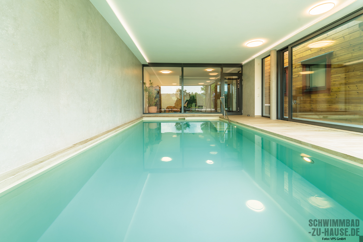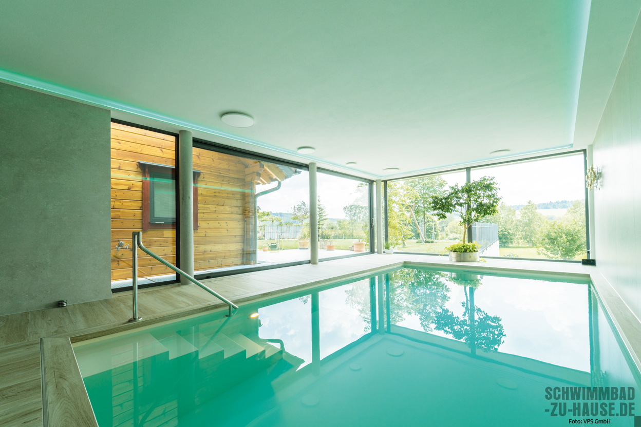 Getreu dem Motto „weniger ist mehr“ zeigt das neu geschaffene Schwimmparadies der Eheleute, dass auch ohne viele Einrichtungsgegenstände ein äußerst ästhetischer Raum entstehen kann. Die Farbgestaltung in Kombination mit der Beleuchtung wirkt äußerst einladend, ein echtes Highlight stellen zudem die großen Fensterfronten beziehungsweise Schiebetüren dar. Gerade in den Sommermonaten bietet sich hier ein fantastischer Ausblick ins Grüne.