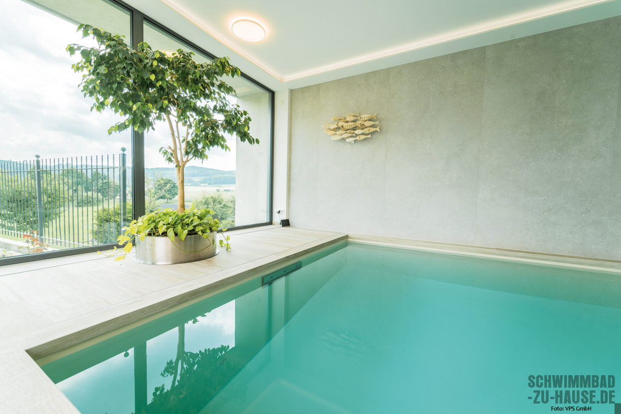 Dem Wunsch nach regelmäßigem Schwimmen wurde bei diesem Poolprojekt mit einer modernen Gegenstromanlage Rechnung getragen. Auch sonst weiß das Hallenbad zu überzeugen, etwa durch die stilsichere Einrichtung und den tollen Ausblick nach draußen.