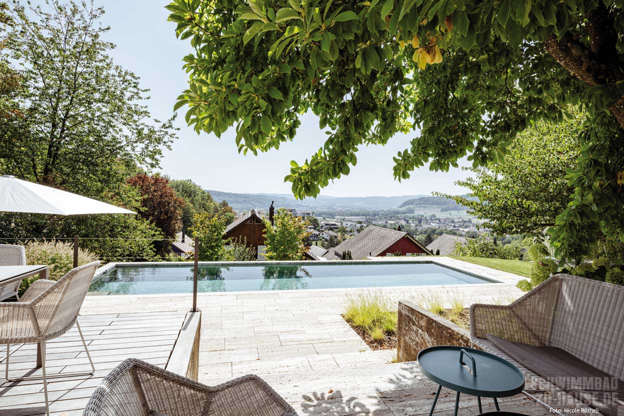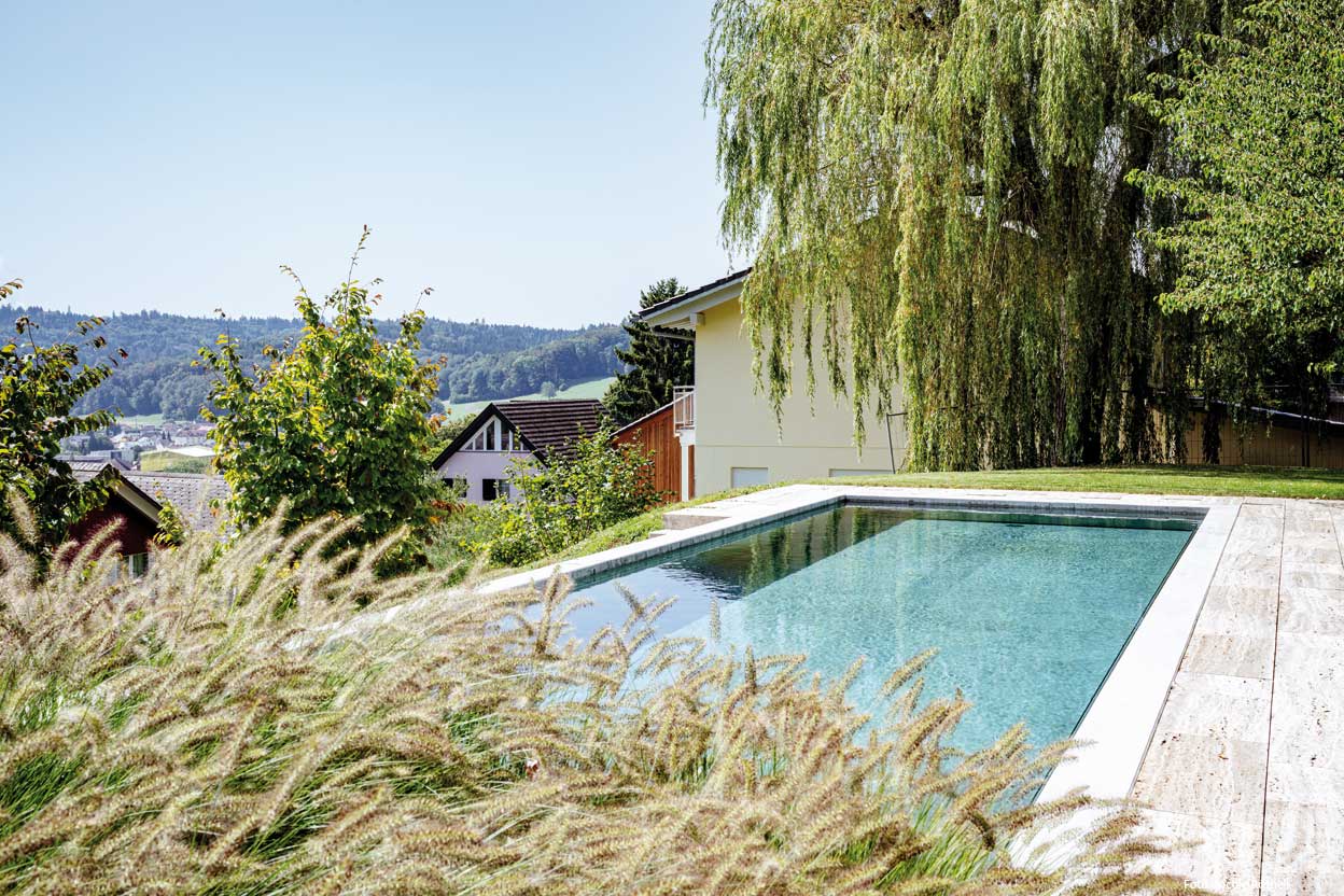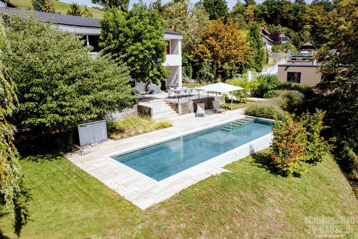 Die Planung und Ausführung der gesamten Umgebungsgestaltung leitete Ralph Belke, Inhaber von Belke Gartenbau aus Lostorf. „Ein Pool in dieser Größe ist an sich schon etwas Besonderes.“ Bei der Planung ließ ihm die Bauherrschaft große Freiheiten. Lediglich zwei konkrete Vorgaben waren zu berücksichtigen: ein Betonpool und die Beibehaltung der bestehenden Terrassierung mit den alten Betonmauern, deren