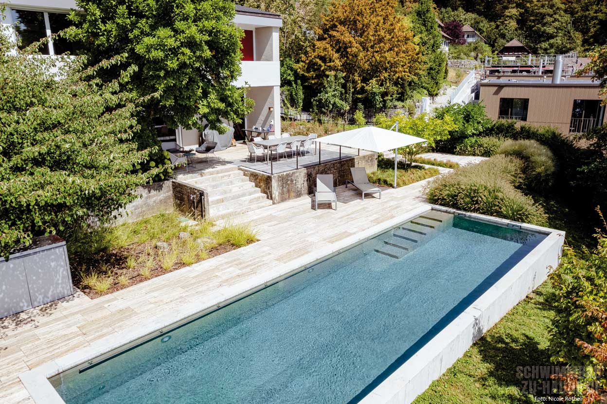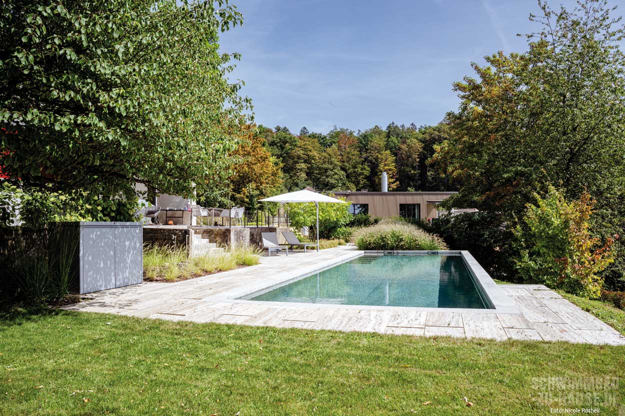 Der Garten erstreckt sich über zwei Ebenen, die sich dem Hang anpassen. Auf der oberen Ebene thront das Haus, ergänzt durch eine großzügige Terrasse, die den Wohnraum ins Freie erweitert. Hier genießt man zwischen Hortensien und Magnolien den Blick auf den Pool. Der Essbereich im Freien ruht auf warmem Holzboden, während heller Travertin die Terrasse und den Poolbereich dominiert. Eine Ebene unterhalb der Terrasse liegt der Pool mit einer Ruhezone. Hier entspannt die Familie unter dem Sonnenschirm oder im erfrischenden Wasser. Der lang gestreckte Betonpool, parallel zum Hang angeordnet, ragt leicht aus dem Gelände heraus. Über sechs breite Stufen gelangt man bequem ins Becken. Dank des Wasseraufbereitungsverfahrens von Ospa, das mit Kochsalz arbeitet, ist das Badewasser ohne Chlorgeruch, sanft zu Haut und Augen.