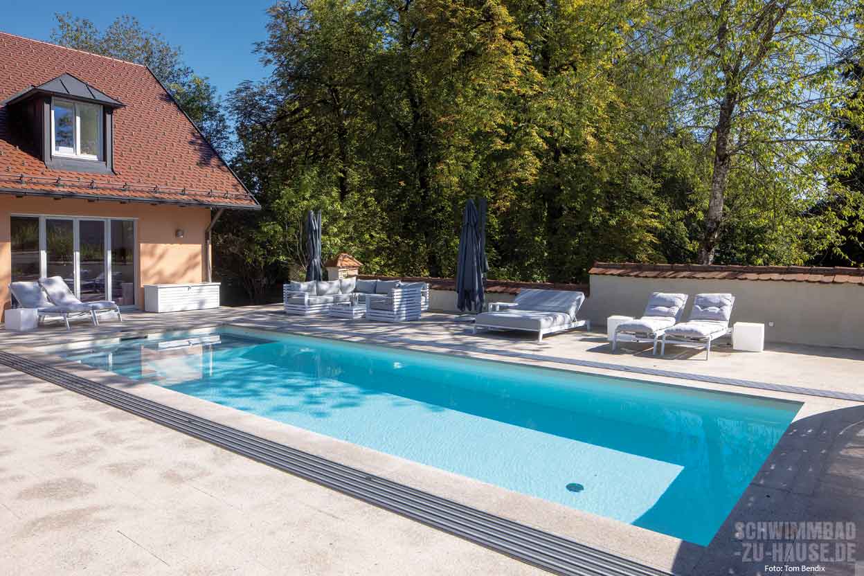 Am Pool von Familie Schneider in Oberbayern zeigt sich, welche Gestaltungsmöglichkeiten Betonbecken bieten. Neben der Optik war aber auch die sportliche Ausstattung des Beckens von großer Wichtigkeit. Bei der Gegenstromanlage fiel die Wahl daher auf die leistungsstarke „Hydrostar“.