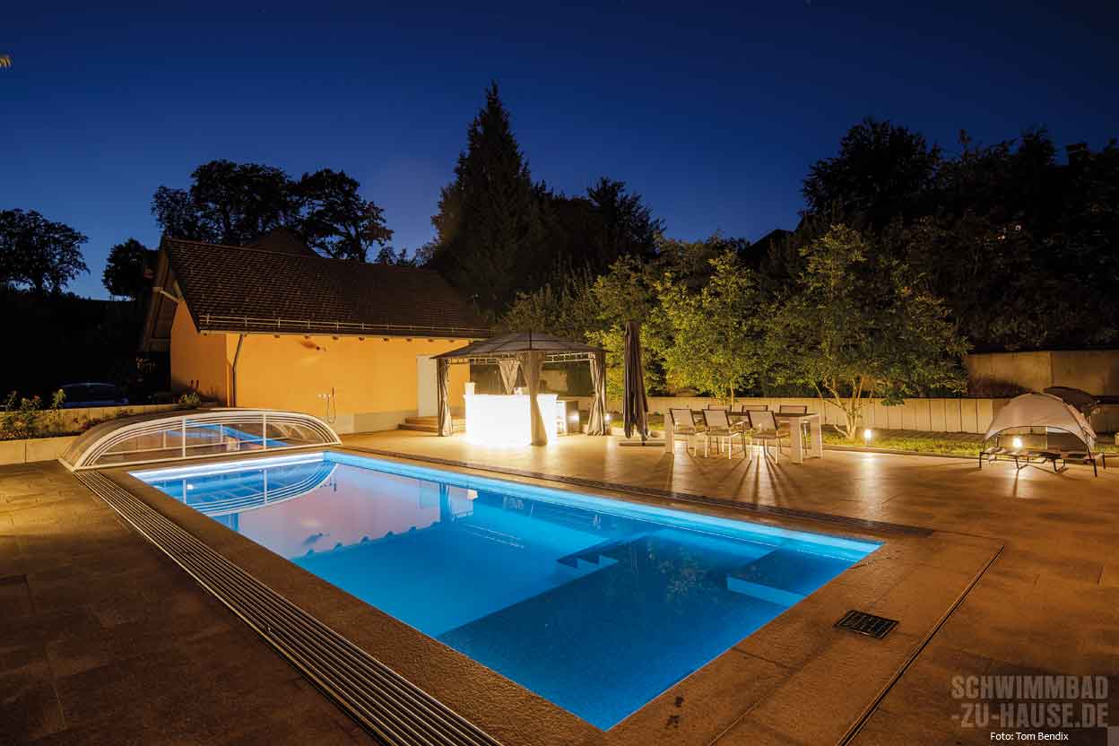 Bei der Beleuchtung des Beckens haben sich die Profis von Aquakonzept etwas ganz Besonderes einfallen lassen: Sie installierten nicht nur zwei LED-Scheinwerfer in der Seitenwand, sondern ließen zusätzlich vom Steinmetz eine Nut in die Beckenrandsteine fräsen. „In der Nut haben wir ein LED-Band verbaut, das in den verschiedensten Farben leuchtet“, beschreibt Rene Passler das Lichtkonzept.