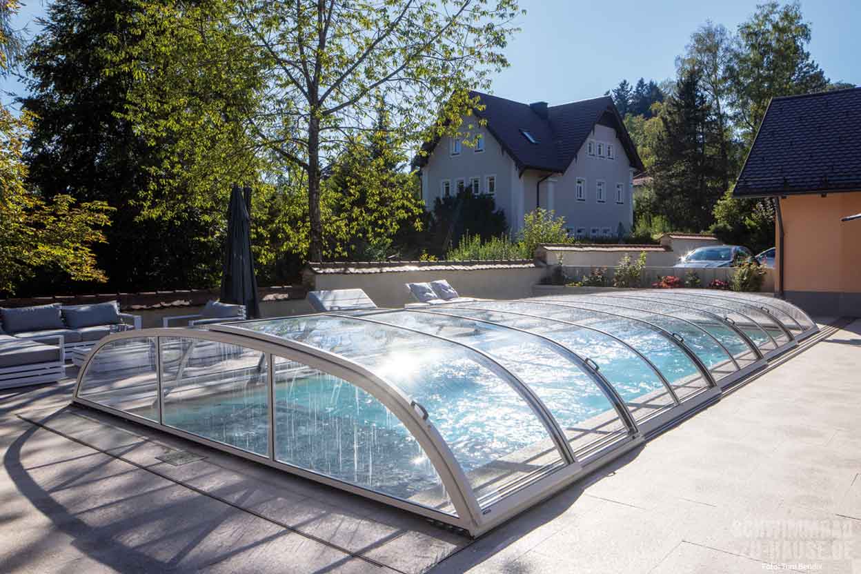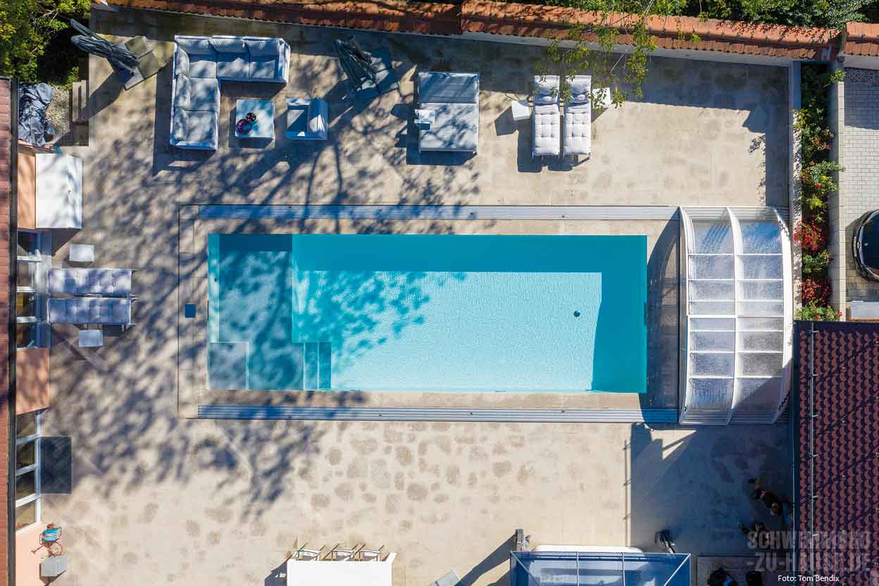 Das Haus von Ute und Wilhelm Schneider liegt am Rand eines kleinen Ortes, aus dem Dachfenster blickt man auf grüne Wiesen und alte Bäume. Zur Entspannung trägt hier der Pool bei, den sich das Ehepaar 2019 in den Garten bauen ließ. Er ist in jeder Hinsicht ein Unikat, denn Schwimmbadbauer Rene Passler hat ihn mit seiner Firma Aquakonzept exakt nach den Wünschen der Bauherren gestaltet.