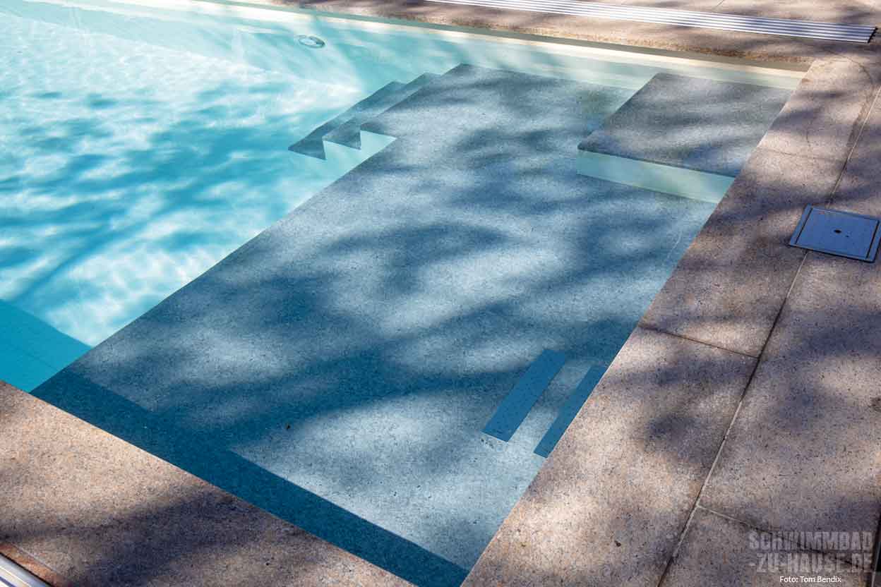 Mit dem Neubau haben er und sein Team das alte achtförmige Becken der Schneiders ersetzt, bei dem die Folie regelmäßig aus der Kederschiene rutschte. Damit das nicht mehr passiert, wünschte sich das Ehepaar einen rechteckigen Pool. Der Schwimmbad-Fachhändler wählte in Abstimmung mit seinem Kunden als Material Styroporsteine, die mit Beton verfüllt werden. Das Becken der Schneiders ist jetzt elf Meter lang und vier Meter breit, wobei ein 2 x 4 Meter großer Teil an der Schmalseite zum Haus hin als Sitzbereich ausgeführt wurde. Hier hat Aquakonzept einen Luftsprudelsitz von Hugo Lahme installiert, der über eine Vielzahl von Massagedüsen verfügt. Als Untergrund für die Sitzfläche in der Flachwasserzone empfahl Rene Passler eine Pool-Folie in Granit-Optik (Renolit Alkorplan „Touch Prestige“). Den Boden und die Wände des Beckens haben die Schwimmbadbauer dagegen mit einer sandfarbenen Folie von Elbtal Plastics ausgekleidet.