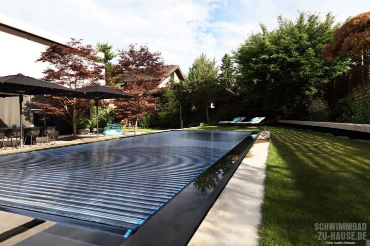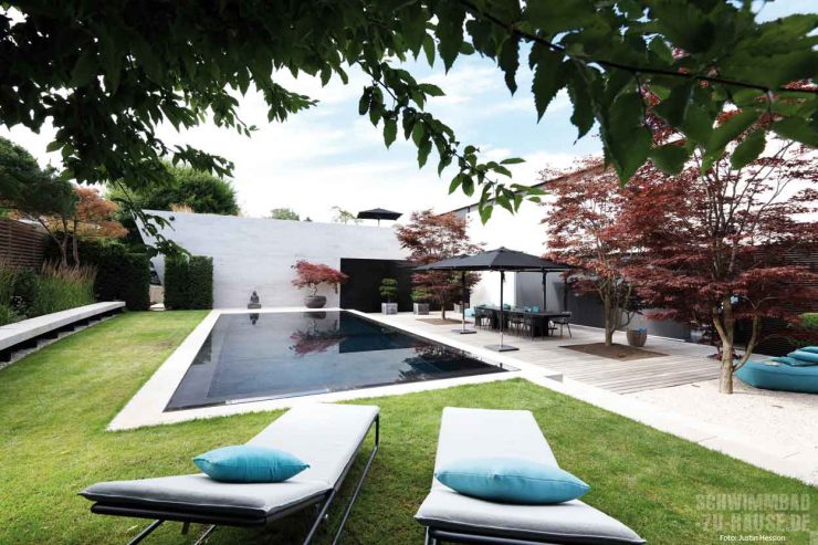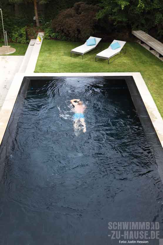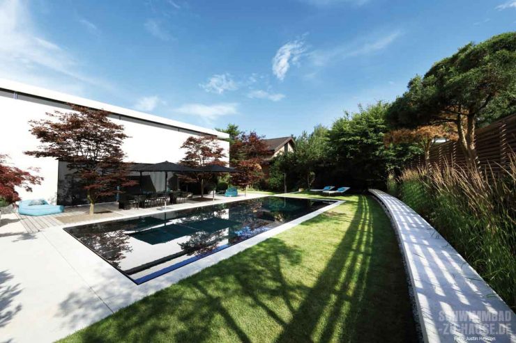 Neues Haus, neuer Pool. Motiviert durch die Leidenschaft zu Wasser und Schwimmen entschied die Familie sich für ein Outdoor-Schwimmbad im Garten, das jetzt alle Blicke auf sich zieht: Gerade, markante Formen, ein schwarz gefliestes Becken und raffinierte Details, etwa die „schwebende“ Treppe, faszinieren – ein Design-Pool für Jung und Alt.