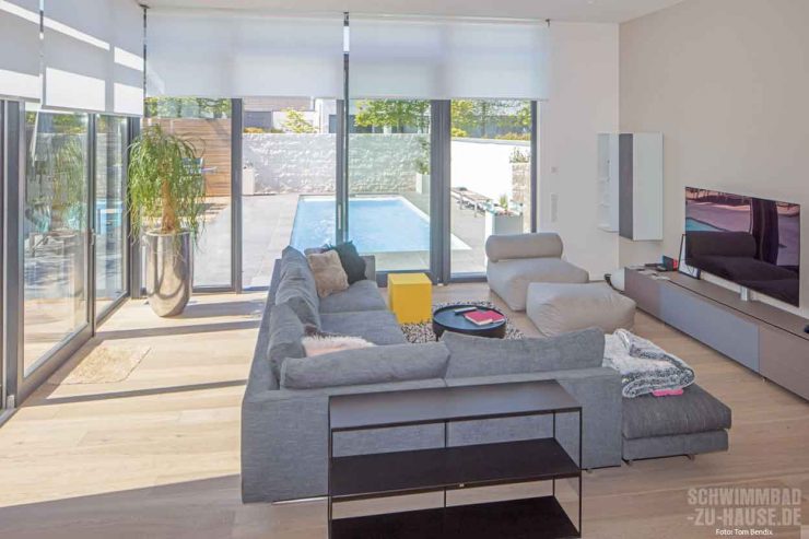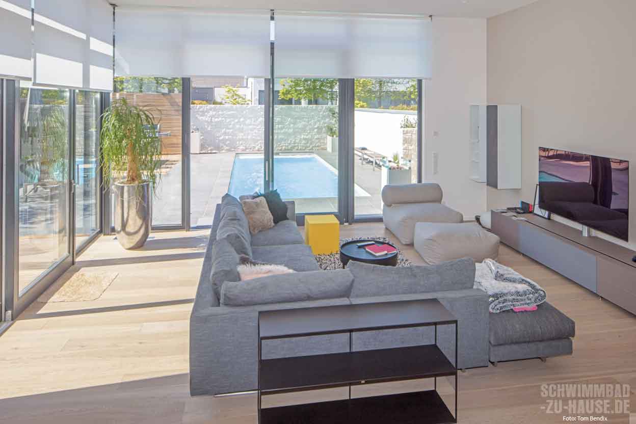 Der Wind streicht träge über die Wasserfläche und verursacht kleine Wellen, die Sonne lässt den eisblauen Pool funkeln und glitzern, die Luft riecht nach Sommer und nur ein leichtes Plätschern durchdringt die noch herrschende Stille. Der Blick von innen aufs Blaue macht Lust, sofort ins kühle Nass zu springen. Ein eigener Pool zu Hause war schon länger ein Ziel der Bauherren, das jetzt mit dem Bau des neuen Hauses auch erreicht wurde.