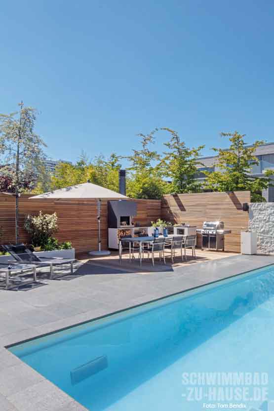 Entstanden ist ein geschmackvoller und gemütlicher Wohnbereich, in dem der Pool im Mittelpunkt steht, aber auch genug Platz für eine große und moderne Außenküche vorhanden ist. Bei schönem Wetter kann die Familie das Leben vollständig nach draußen verlegen. „Wir hatten am Haus vorher einen Rasen. Da unser Garten ein Stadtgarten ist, haben wir nicht so viel Platz wie auf dem Land, wo man Wiese und Außenpool schön kombinieren kann. Statt nun eine Minirasenfläche anzulegen, waren meine Frau und ich uns schnell einig, dass wir den Rasen einfach weglassen. Auch im alten Haus hatten unsere Kinder eher die Steinplattenbereiche zum Spielen mit Rollern, Tennis oder Bällen genutzt. Wir betrachten die Wasserfläche als Ersatz für den Rasen. Es ist doch sehr beruhigend auf Wasser zu schauen, tagsüber sowie abends“, so der Bauherr im weiteren Gespräch.