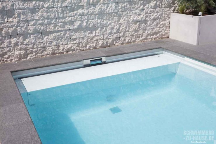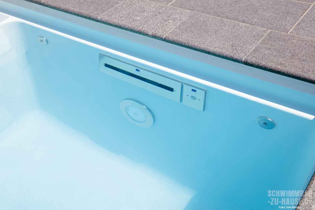 Es ist aber nicht nur angenehm, aufs Wasser zu schauen, sondern auch, sich darin zu bewegen. Alle Familienmitglieder sind große Sportfans. Die Kinder sind im Schwimmverein, und auch die Bauherren hegen eine große Leidenschaft fürs Schwimmen. Um ins öffentliche Schwimmbad zu gehen, fehlte aber oft die Zeit. Ein Pool zu Hause ist mit viel weniger Zeitaufwand nutzbar. Bei so viel Sportbegeisterung war es klar, dass eine kräftige Gegenstromanlage ein Muss ist. Aufgrund des schlichten Designs entschieden sich die Bauherren für die Anlage „Triva“ der Firma Uwe Jetstream.
