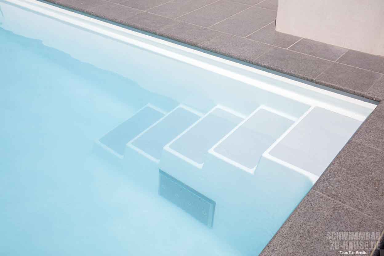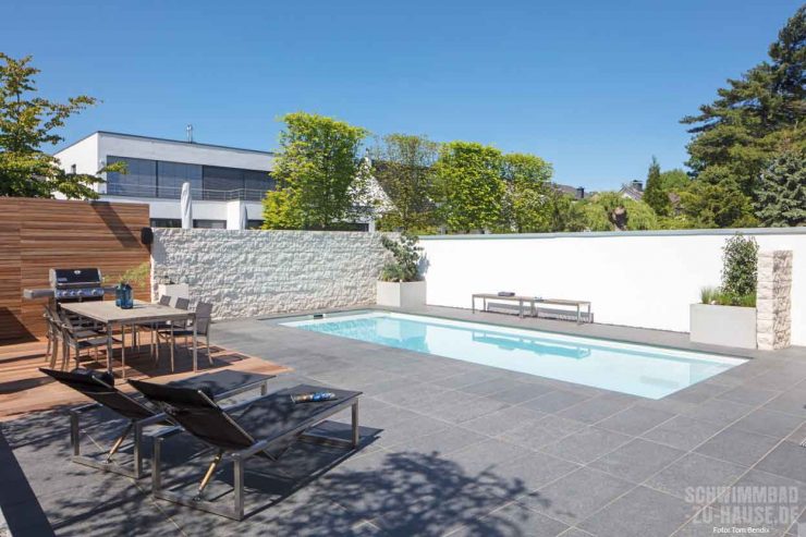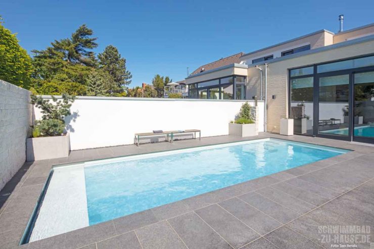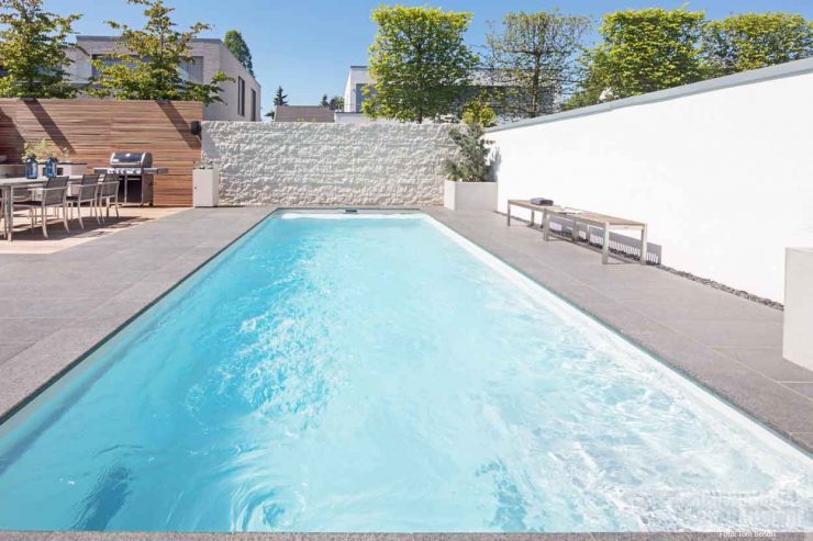 Der Bau des 8,50 x 3,20 x 1,50 Meter großen Pools war für die Poolbauer von Kimmerle aber eine kleine Herausforderung: „Wir durften erst nach Beendigung der Bauphase des Hauses den Pool in den Garten setzen. Somit musste ein großer Kran in einer Stichstraße aufgebaut werden“, erinnert sich das Team von Kimmerle im Interview.