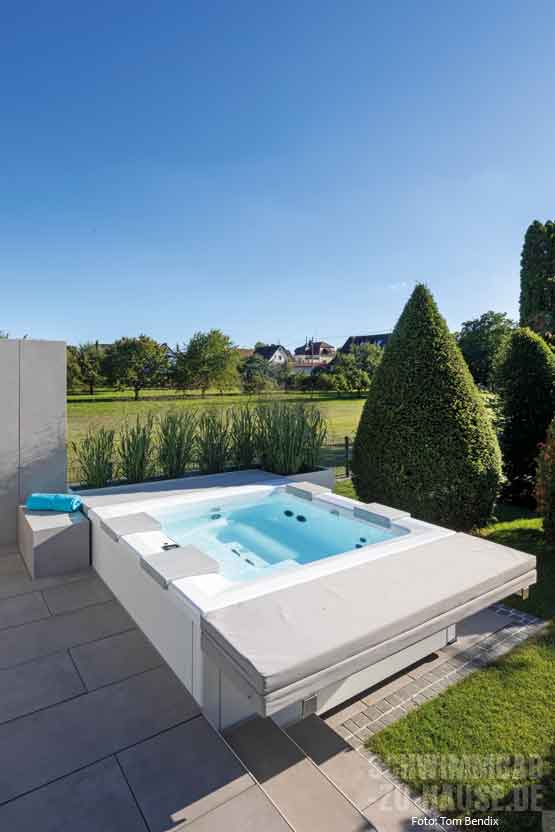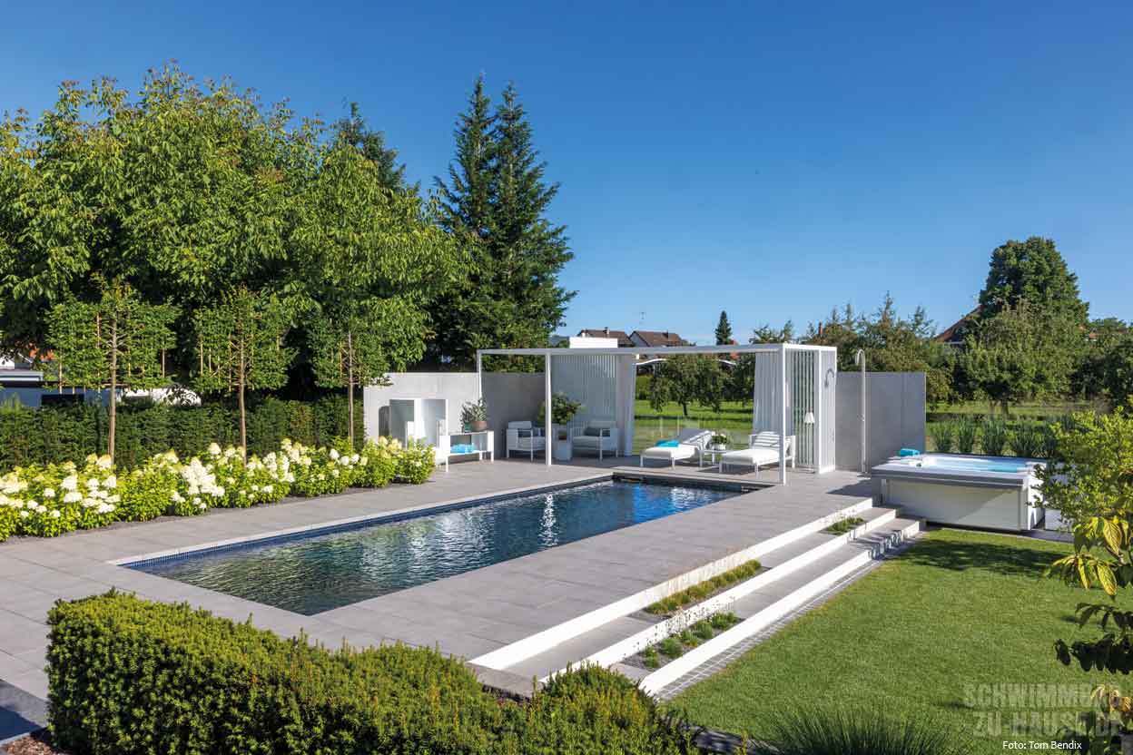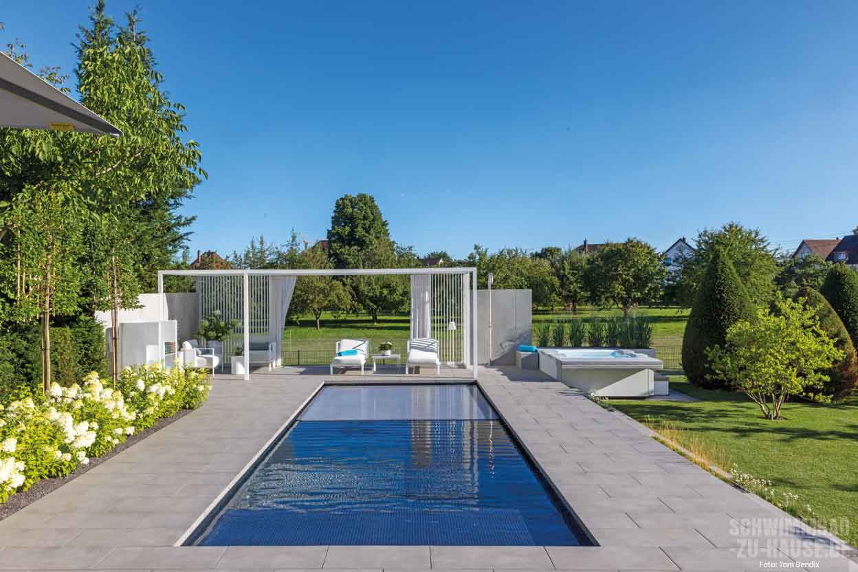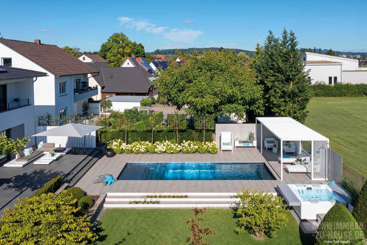 Wenn man an einem der sonnigsten Orte Deutschlands wohnt, macht es Sinn, das Leben in den warmen Monaten nach draußen zu erweitern – und sich den Garten so gemütlich und luxuriös wie möglich zu gestalten. Genau dieses Ziel verfolgte die Bauherrenfamilie dieses erstklassigen Outdoor-Projekts am Bodensee. Wichtig war bereits bei der Planung, dass ein großzügiger Pool Herzstück des neuen „Wohnzimmers” im Garten werden sollte. Hier wünschten sich die Bauherren neben einer leistungsstarken Gegenstromanlage für das tägliche Schwimmtraining auch einen Flachwasserbereich zur Entspannung nach dem Sport. Das i-Tüpfelchen des Ganzen sollte ein moderner Whirlpool bilden, der mit seinem warmen Wasser die beanspruchten Muskeln angenehm massiert.