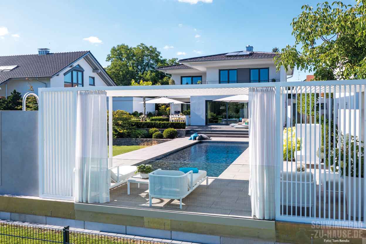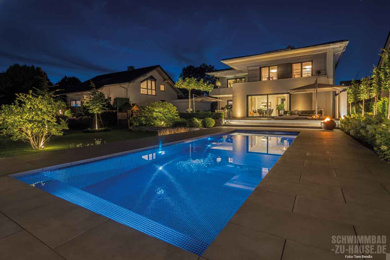 Für die Planung und fachgerechte Umsetzung vertraute man dem erfahrenen Team von Bergmann Pools. Der zuständige Schwimmbadbauer Steffen Bergmann denkt im Gespräch mit haus+wellness* an die Aufgabe zurück: „Besonders großen Wert wurde auf ein einheitliches stimmungsvolles Ambiente gelegt, das den etwas tiefer liegenden Garten harmonisch in den Wohnbereich einbezieht und alle Elemente natürlich inszeniert.“