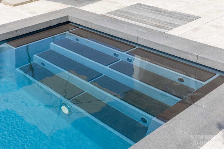 Selbstverständlich ließ man auch den Faktor Energieeffizienz nicht außer Acht. Während die Dosieranlage die Desinfektion auf ein Minimum reduziert und das Becken per Inverter-Wärmepumpe effizient beheizt wird, verhindert eine Rollladenabdeckung, die bei Nichtbenutzung des Beckens über die Wasseroberfläche gerollt wird, Wärmeverluste und Verschmutzungen.