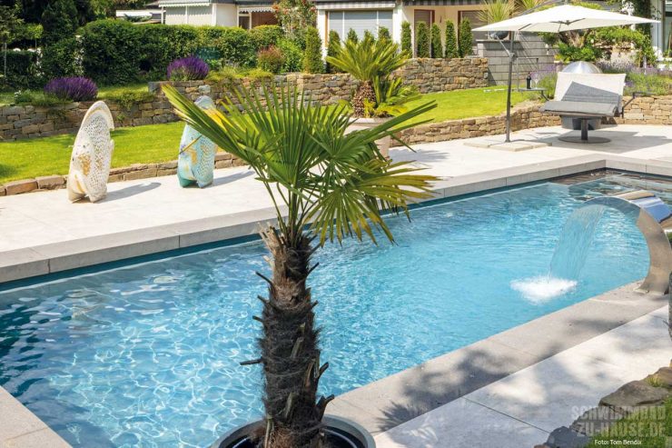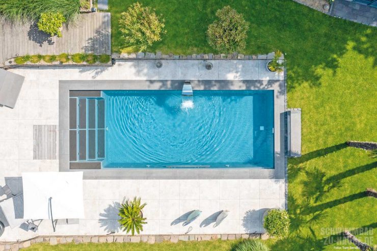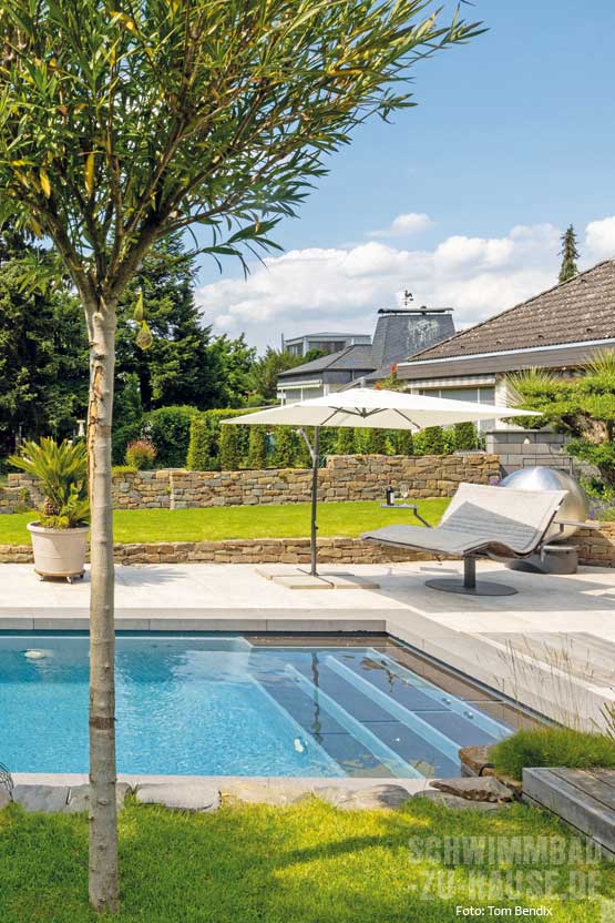 „Aufgrund der klaren Vorstellungen des Bauherrn war die Umsetzung sehr zielgerichtet“, erinnert sich der zuständige Schwimmbadbauer Steffen Eichmann im Gespräch mit haus+wellness*. Die Materialien für Randsteine sowie für die Terrassenplatten und auch die Bepflanzung der Poolumgebung wählte der Bauherr selbst aus. Besonders wichtig war ihm zudem die stringent eingehaltene und in sich stimmige optische Sprache: eine unaufdringliche und zeitlose Beckenfarbe in Steingrau (Natursteinoptik), klare Linien und ein massiver Beckenrandstein aus Basalt mit Nase ins Becken.