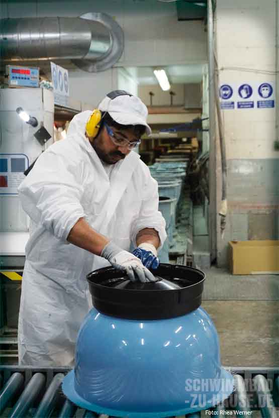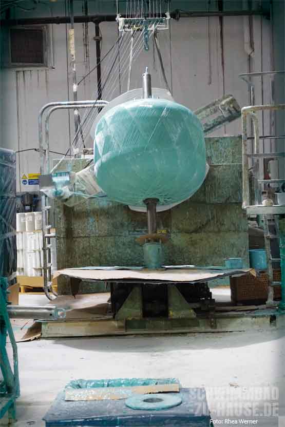 Im Anschluss an die Wicklung werden die Kessel – je nach individuellen Vorgaben der einzelnen Kunden – mit Anschlussöffnungen versehen. Diese werden mittels feiner Fräsen in den Korpus geschnitten. Verbindungsstücke aus PVC werden nachfolgend per Hand und mittels moderner Maschinen auf die Öffnungen geschraubt, sodass später Verrohrungen, Deckel, Ventile und Verbindungsschläuche exakt montiert werden können. Und auch im Inneren der Druckbehälter werden die einzelnen Komponenten bereits im Werk angebracht. Verschiedene Kunststoffspritzteile, die je nach Kesselart variieren, werden entweder auf angepasste Sammelscheiben oder auf doppelte Böden mit Schlauchverbundstücken positioniert. Dann montieren die Arbeiter die inneren Filtrationsverbundstücke, damit das Wasser am Schluss perfekt durch den Behälter geführt werden kann.